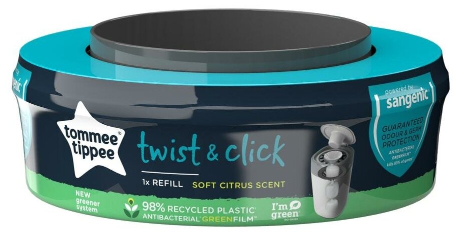 Tommee Tippee кассеты (1 шт.) для утилизатора подгузников, накопителя для использованных подгузников Twist& Click Кассеты Tommee Tippee Twist& Click Advanced для утилизатора подгузников. Выполнены из экологически чистого антибактериального материала Greenfilm™. В упаковке 1 штука. Материалы кассеты, включая пленку - 100% биоразлагаемы. Многослойный антибактериальный материал GREENFILM™ в 100 раз эффективнее обычных пакетов для подгузников, поскольку он защищен биоцидом серебра Biomaster (антибактериальная защита присутствует только в пленке. Пленка обработана биоцидом серебра Biomaster, протестированным в соответствии с ISO 22196-2011) и уничтожает 99 % опасных микробов, таких как E-coli и Staphylococcus Aureus. Важное дополнение.Система утилизации подгузников Twist& Click совместима только со сменными кассетами Tommee Tippee Twist& Click.