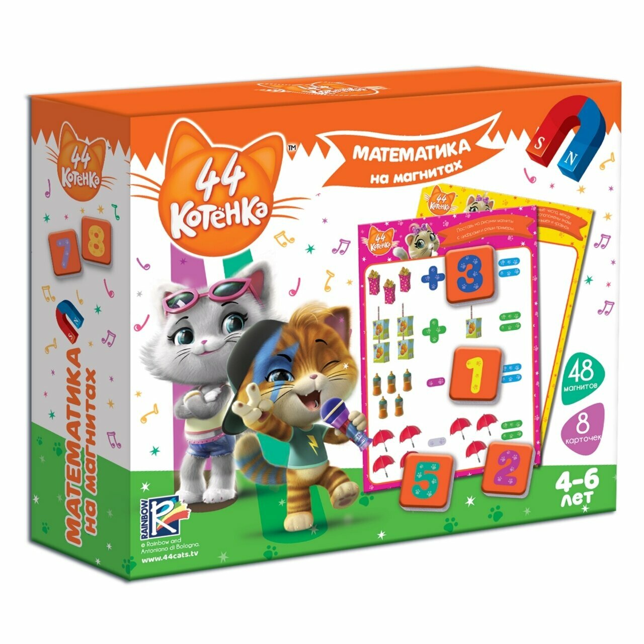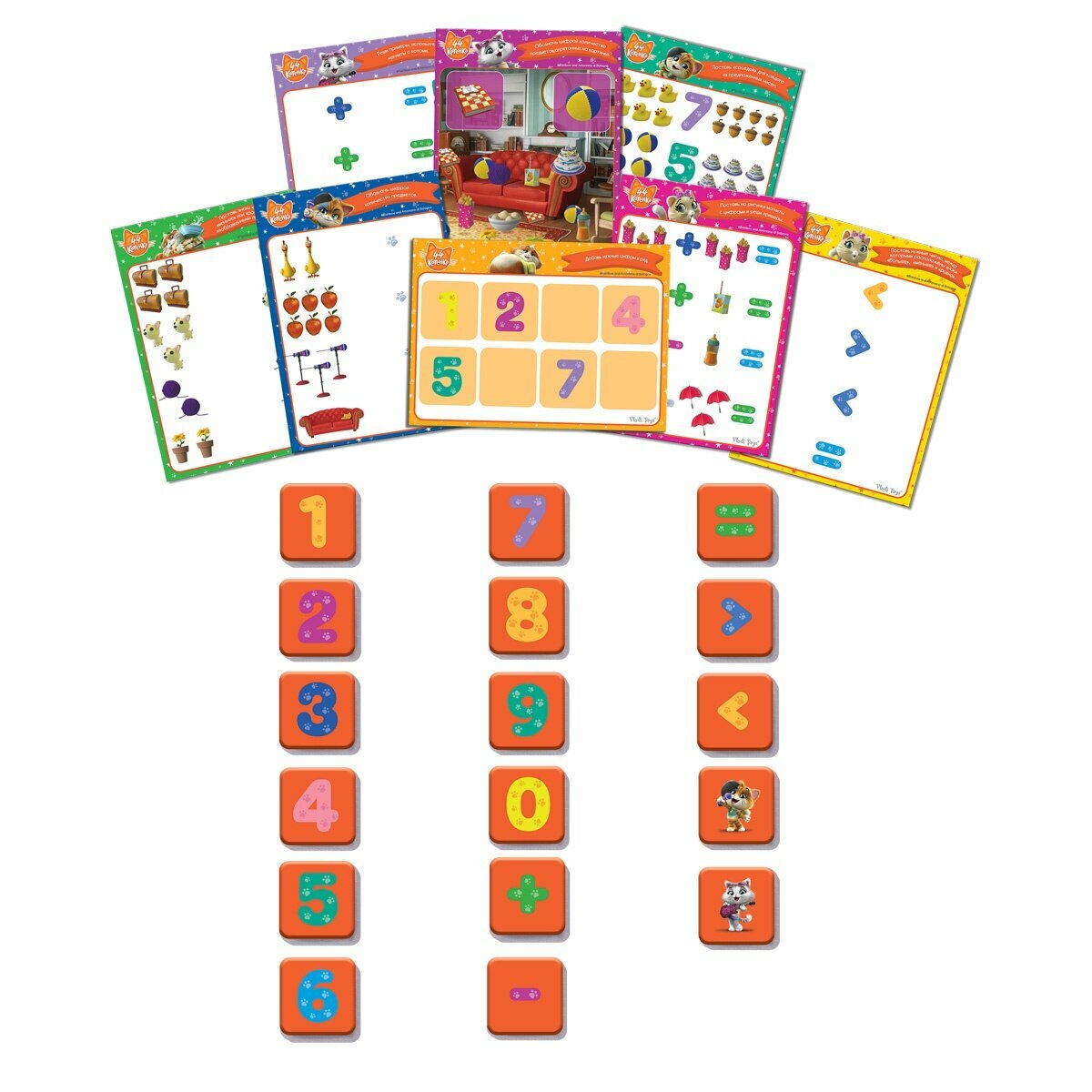 Vladi Toys Магнитная математика для детей 44 Котенка Пушистые друзья подготовили специально для малыша мягкие магнитные цифры, которые помогут ему быстро и легко усвоить основы математики! Весь пройденный материал можно закрепить, выполняя задания на карточках. Повторяйте цифры, составляйте уравнения, решайте примеры. И все это вместе с героями любимого мультсериала 44 Котенка. Играть можно как на специальной магнитной доске, так и на холодильнике. Благодаря игре малыш быстро запомнит цифры, научится сравнивать их значения, а также потренирует логическое мышление, память и речь.