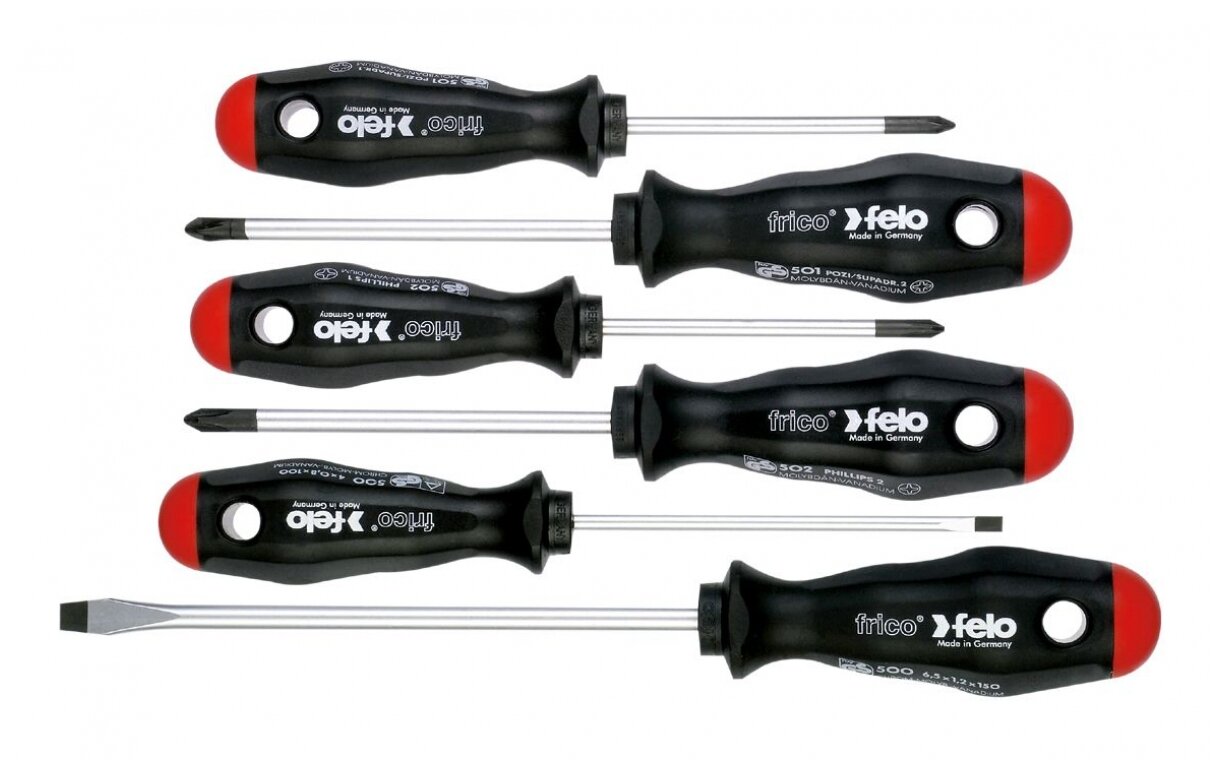**Набор отверток Felo ** представляет собой необходимый в каждом доме комплект инструментов. Отвертки выполнены в едином стиле, но различаются по назначению и типу наконечника. В наборе представлены две шлицевые отвертки (SL 4,0 x 0,8 x 100 и SL 6,5 x 1,2 x 150) и четыре крестовые (PH 1 х 80, PH 2 х 100, PZ 1 х 80, PZ 2 х 100). Шлицевые отвертки предназначены для манипуляций с плоскими винтами и шурупами, крестовая — для работ с крестообразными винтами. Рабочая часть инструментов изготовлена из высокопрочной хромомолибденованадиевой стали, что значительно продлевает срок службы изделий. Прорезиненная ручка обеспечивает комфортный хват инструмента и предотвращает его выпадение во время работы.
