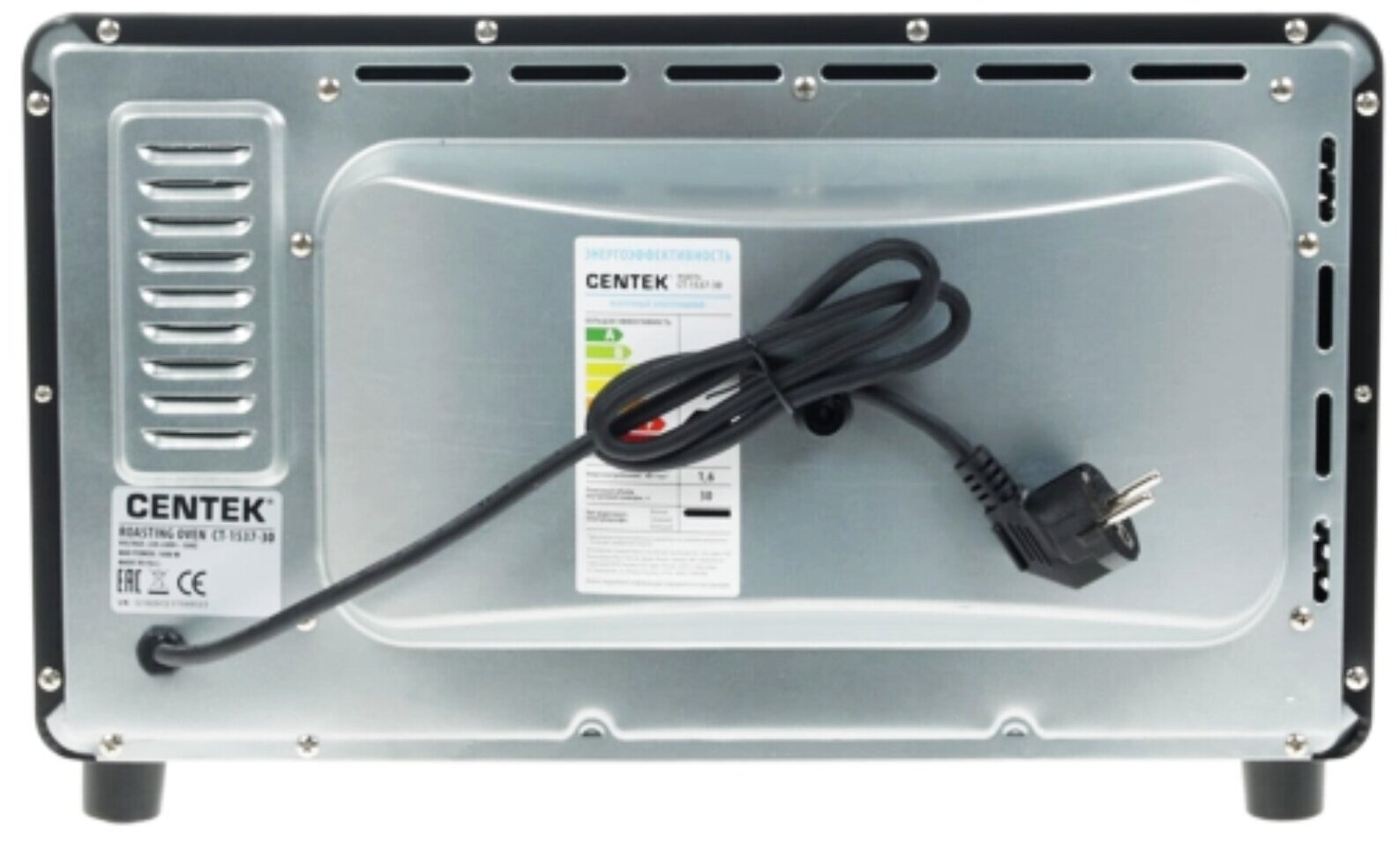 | Прочие особенности и свойства | Электропечь Centek CT-1538-50 не имеет конфорок, зато оснащена большим внутренним пространством. Это позволяет запекать внутри печи гуся целиком или поставить на верхний и нижний уровень по противню с пирогами. При этом электропечь отличается небольшими размерами и имеет ножки, чтобы безопасно устанавливаться на любые поверхности на кухне. Ее температурный диапазон варьируется от 100 до 320 С. Модель оснащена таймером обратного отсчета на 90 минут. Сетевой шнур модели обладает длиной 90 см, а эмалированное внутреннее покрытие электропечи легко очищается. Centek CT-1538-50 имеет усиленные нагревательные элементы, что ускоряет процесс приготовления пищи, и хромированные поворотные переключатели, при помощи которых осуществляется управление прибором.,,Звуковой сигнал готовности |
