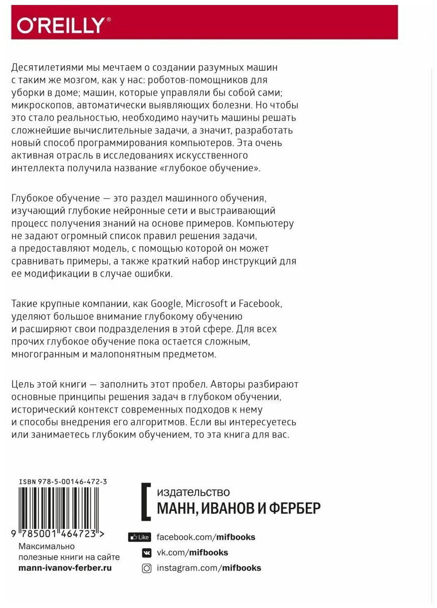 С оживлением нейросетей в 2000-е годы глубокое обучение стало чрезвычайно активно развивающейся областью исследования, прокладывающей путь современному машинному обучению. Эта книга предлагает примеры и толкования, которые помогут понять основные идеи в этой сложной отрасли знаний. Такие крупные компании, как Google, Microsoft и Facebook, обратили внимание на глубокое обучение и активно увеличивают штат своих подразделений, работающих в этой области. Для всех остальных оно остается все еще сложным, комплексным и трудноуловимым предметом. Исследования переполнены непонятным жаргоном, а разрозненные учебники, имеющиеся в сети, не дают должного представления о том, как решаются задачи в этой области. Цель этой книги — заполнить данный пробел.