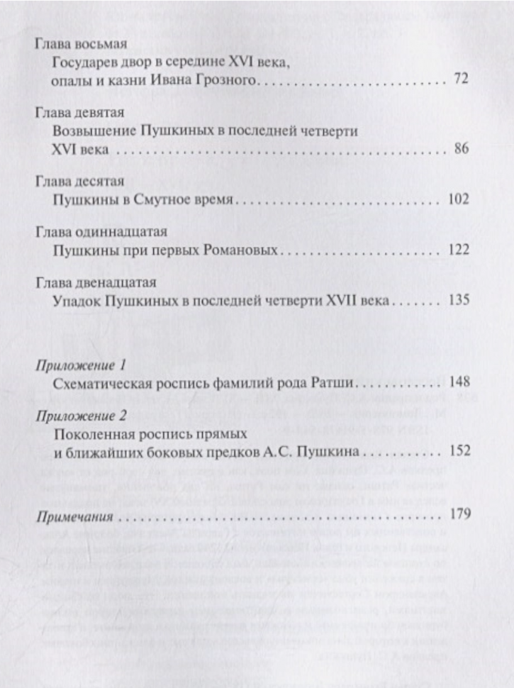 Весьма интересная книга, итог впечатляющих трудов историка Степана Веселовского. Автор построил генеалогическую таблицу (она приведена в конце книги), в которой прослеживает историю предков Пушкина от рода Ратши, в четвёртом колене от которого значится Гаврило Алексеич, витязя великого князя Александра Невского, а сам Александр Сергеевич является представителем 20-го колена от Ратши. В поколенной росписи подробно представлены все персоны, вплоть до ближайших потомков Пушкина (это уже 21-е поколение от Ратши) - и эта работа представляется практически невероятной по своей сложности и грандиозности. Автор рассказывает о предках Пушкина в двенадцати главах. В качестве постскриптума отмечу, что история африканских предков Пушкина в книге не рассматривается.