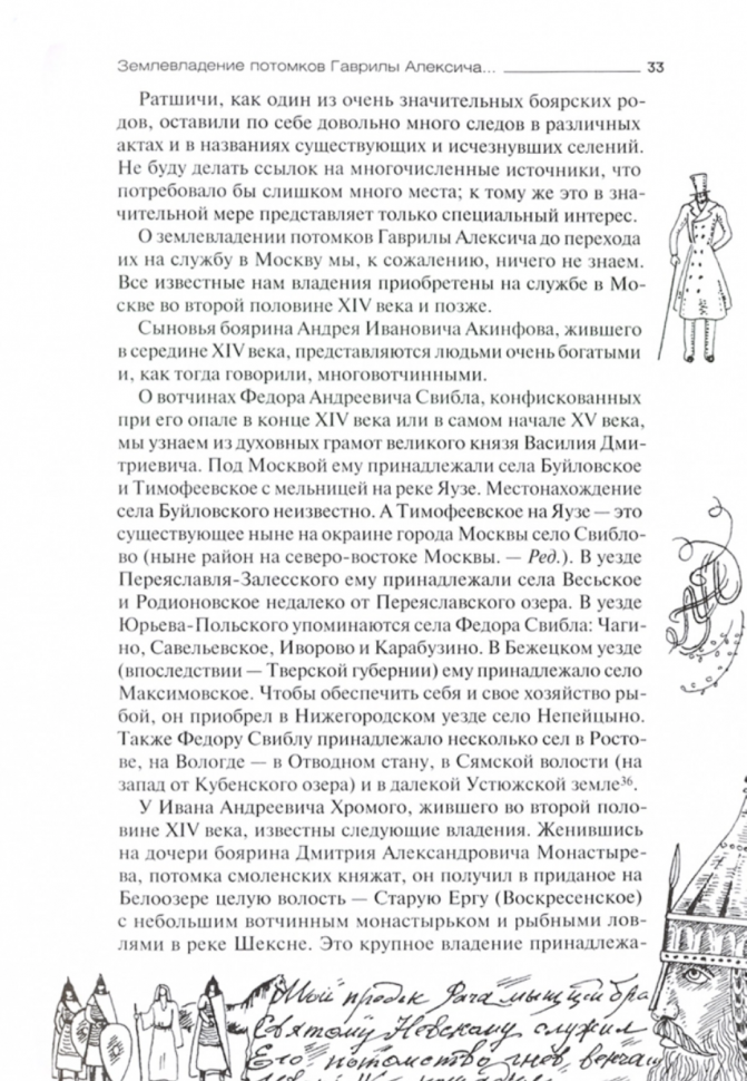 Степан Веселовский проделал титаническую работу по выявлению предков А. С. Пушкина. Сам поэт, как известно, вел свой род от "мужа честна" Ратши, однако ни сам Ратша, ни два поколения, упомянутые вслед за ним в Государевом родословце середины XVI века, не поддаются проверке с помощью источников. Настоящая история рода Пушкиных и родственных им родов начинается с Гаврилы Алексича, боярина Александра Невского и героя Невской битвы 1240 года, - он на коне ворвался по сходням на вражеский корабль, был сброшен в воду, но выплыл и затем в сражении убил "епискупа" и воеводу шведов. Между ним и нашим Александром Сергеевичем пятнадцать поколений. Это люди со своими занятиями, религиозными и политическими взглядами, порой весьма бурными биографиями, и о каждом из них сказано в этой книге, в приложении к которой дана поколенная роспись прямых и ближайших боковых предков А. С. Пушкина.