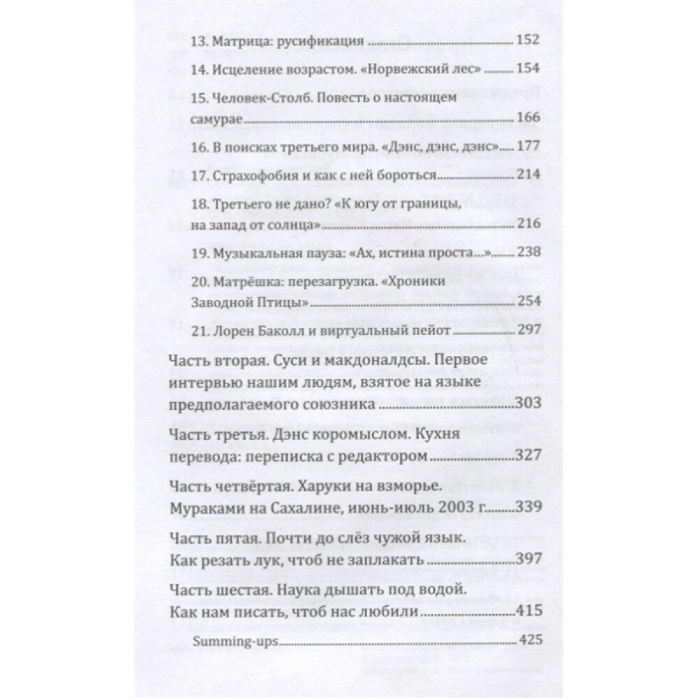 Отличная книга, капитальный труд главного переводчика Харуки Мураками, есть еще второй том. В книгу вошел "разбор" следующих произведений : "Слушай песню ветра", "Пинбол 1973", "Охота на овец", " Страна Чудес без тормозов" и Конец света", "Норвежский лес", "Дэнс, дэнс, дэнс", "К югу от границы, на запад от солнца". "Хроники заводной птицы". Твердый переплет, книга объемная по содержанию 432 страницы.
