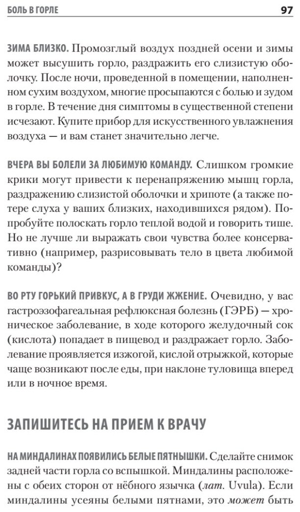В книге разбираются наиболее часто встречающиеся симптомы для разных частей человеческого тела. Соответственно симптомам даны рекомендации квалифицированных врачей: насколько все серьезно, стоит ли обратиться к врачу или пора скорую вызывать. Учитывая, что интернет заполнен зачастую непроверенной информацией, информацией призванной зарабатывать, я предпочту полистать статьи специалистов. И всем рекомендую.