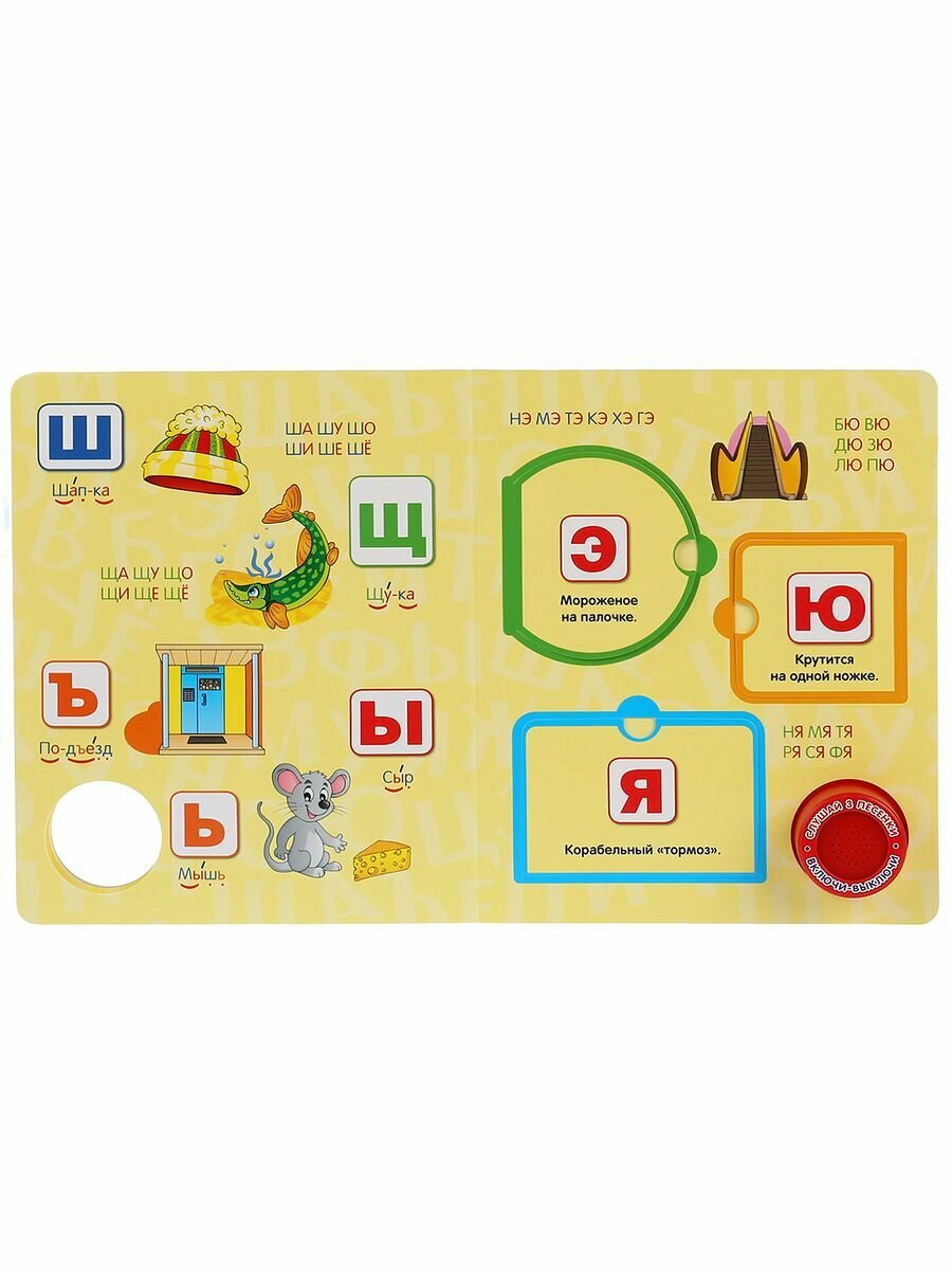 На каждой страничке красивые иллюстрации, буквы и окошки с заданиями. Ребёнок будет с удовольствием рассматривать яркие страницы с изображением животных и предметов, открывать окошки, смотреть кто там спрятался, слушать песни и подпевать. Освоить включение звука легко: по нажатию на кнопку начинает проигрываться песенка, при втором нажатии звук выключится. Композиции исполняются профессиональными артистами. Книжка сделана из плотного картона, поэтому можно не опасаться, что ребёнок порвёт странички.