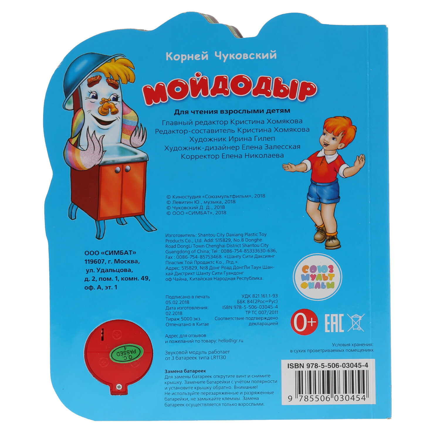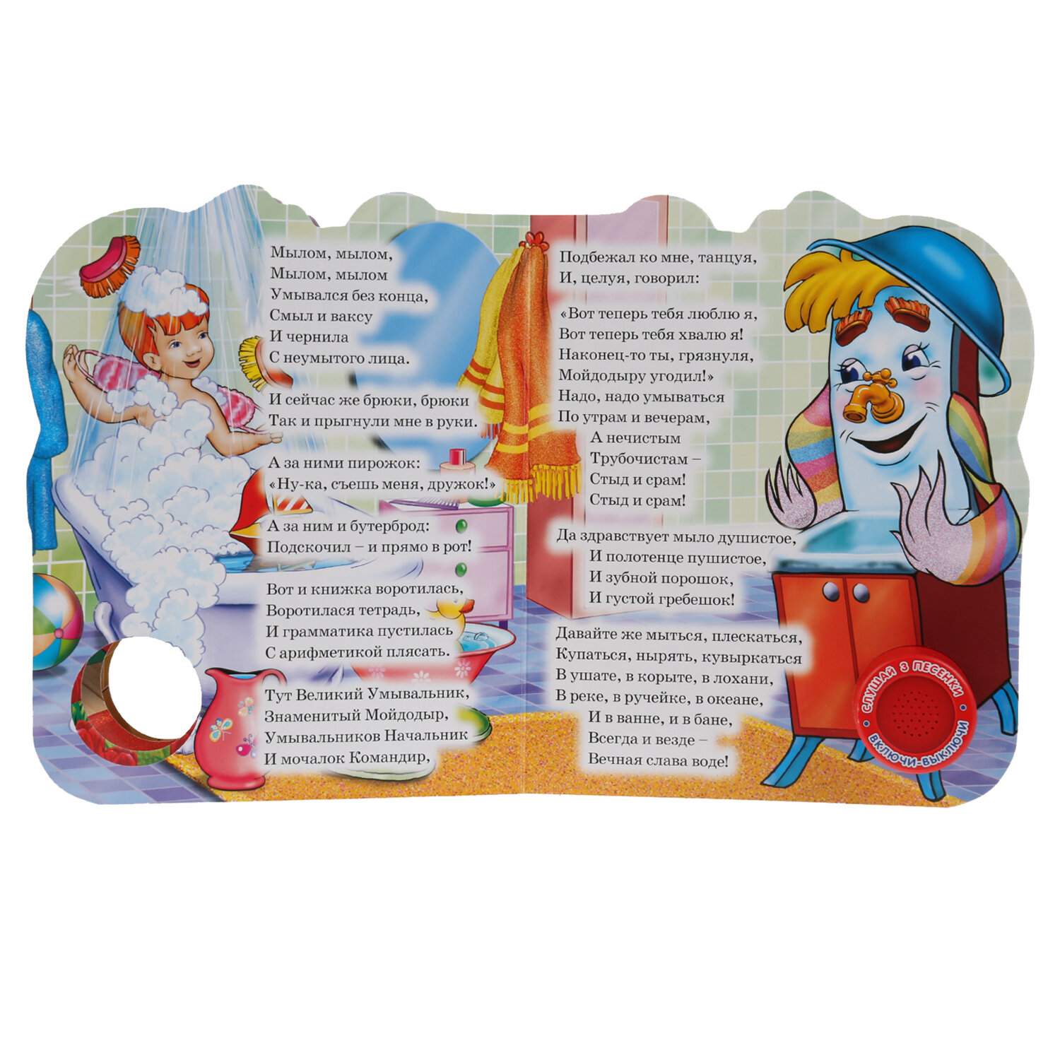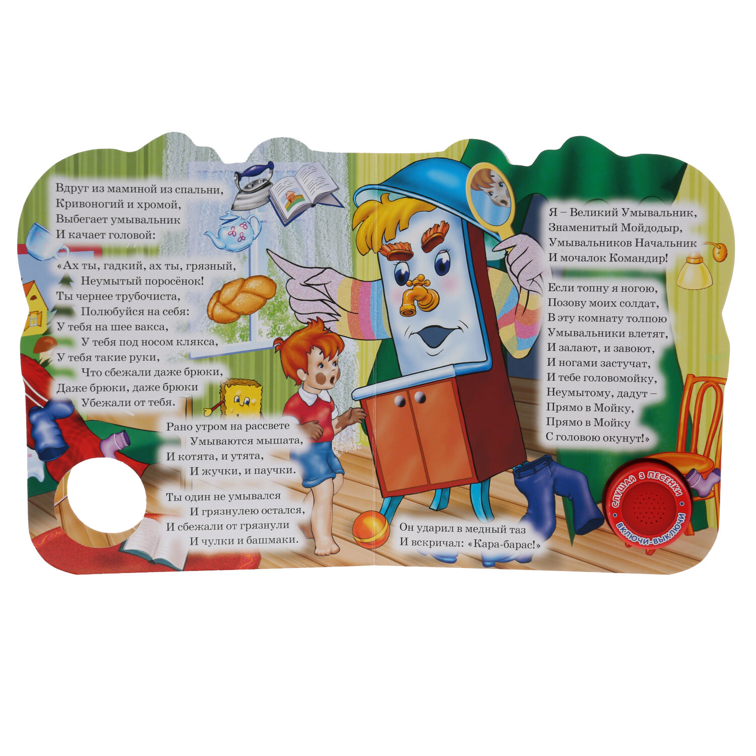 Книга с песенкой "Мойдодыр" К. Чуковского компактная книга из прочного безопасного картона с кнопкой для прослушивания песенки из мультфильма - лучший выбор для первого чтения малышу. Сюжеты сказок основаны на сценариях добрых познавательных советских мультфильмов с любимыми песенками детства. Крупные и красочные иллюстрации с узнаваемыми мультяшными героями увлекут ребёнка в волшебную страну сказок. А чтение авторского текста будет способствовать развитию пассивного словаря малыша.