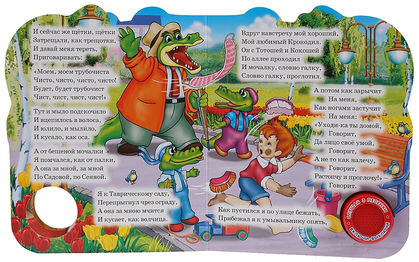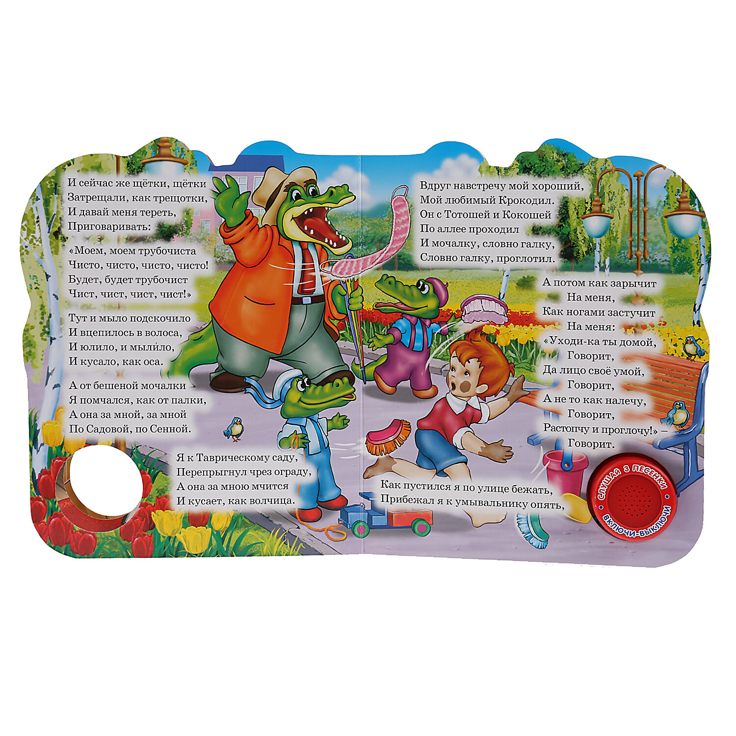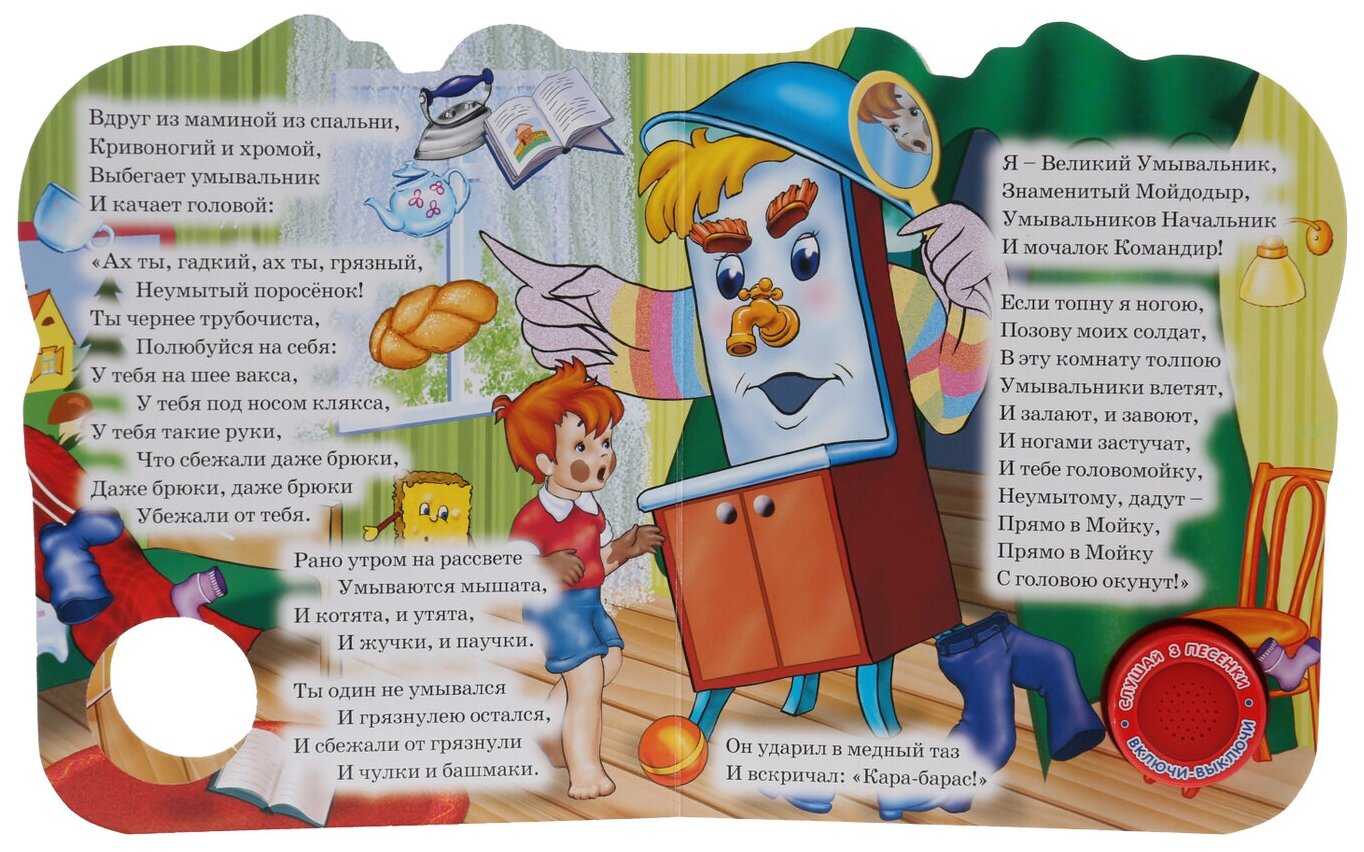 Книга с песенкой "Мойдодыр" К. Чуковского компактная книга из прочного безопасного картона с кнопкой для прослушивания песенки из мультфильма - лучший выбор для первого чтения малышу. Сюжеты сказок основаны на сценариях добрых познавательных советских мультфильмов с любимыми песенками детства. Крупные и красочные иллюстрации с узнаваемыми мультяшными героями увлекут ребёнка в волшебную страну сказок. А чтение авторского текста будет способствовать развитию пассивного словаря малыша.