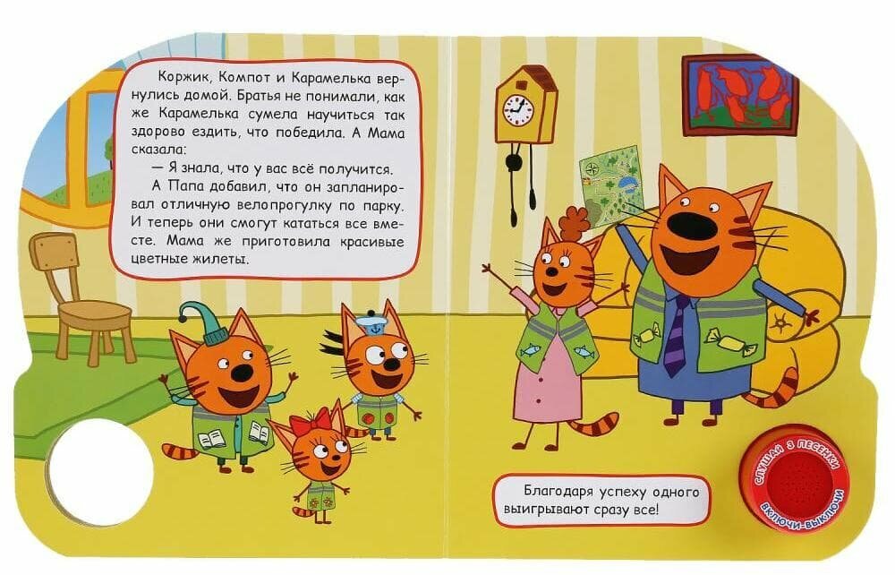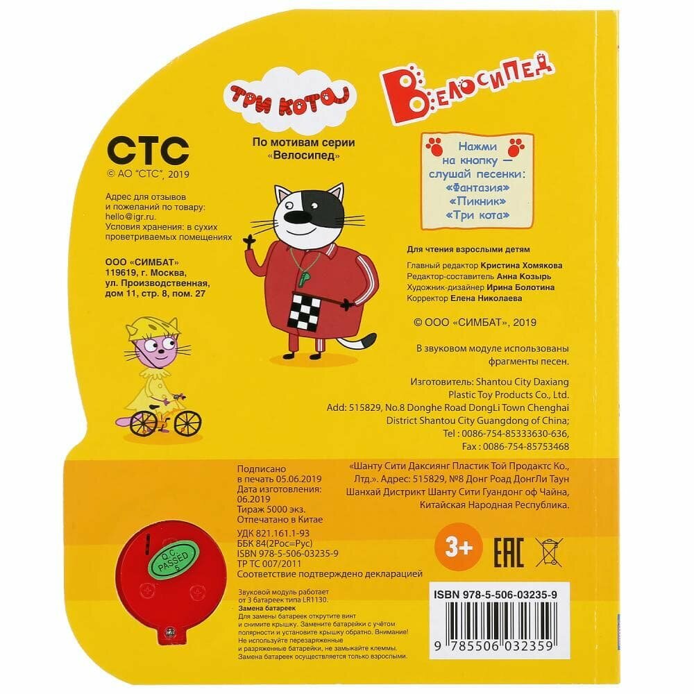 1 звуковая кнопка3 песенкиИсторияУкомплектовано 3 батарейками типа LR1130 (батарейки меняются)Количество страниц: 8Размер упаковки, см: 19 х 16 х 2Вес в упаковке, г: 160На каждой страничке красивые иллюстрации с историей по мотивом серии из мультфильма «Три кота». Малыш будет с удовольствием рассматривать яркие страницы с изображением любимых персонажей, читать историю, слушать песни, подпевать и даже танцевать. Ребёнок легко освоит включение звука: по нажатию на кнопку начинает проигрываться песенка, при втором нажатии звук выключится. Нажав на кнопку ещё раз ребёнок, услышит следующую песню. Композиции исполняются профессиональными артистами. Книжка сделана из плотного картона, поэтому можно не опасаться, что ребёнок порвёт странички.
