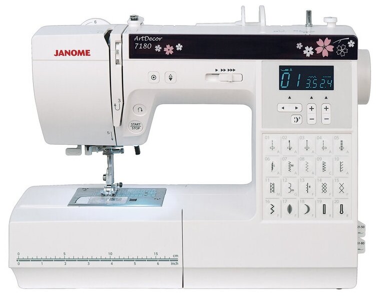 Швейная машина Janome ArtDecor 7180 со скоростью шитья 820 ст/мин способна выполнить 80 операций. Устройство имеет 20 понятных кнопок для быстрого управления, кнопки для позиционирования иглы и Старт/Стоп. Для удобства использования предусмотрены светодиодное освещение и нитевдеватель.