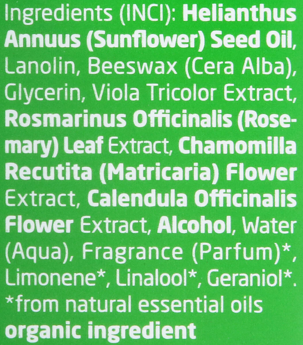 | Состав | Helianthus Annuus (Sunflower) Seed Oil, Lanolin, Beeswax (Cera Alba), Glycerin, Viola Tricolor Extract, Rosmarinus Officinalis (Rosemary) Leaf Extract, Chamomilla Recutita (Matricaria) Flower Extract, Calendula Officinalis Flower Extract, Alcohol, Water (Aqua), Fragrance (Parfum)*, Limonene*, Linalool*, Geraniol*. |