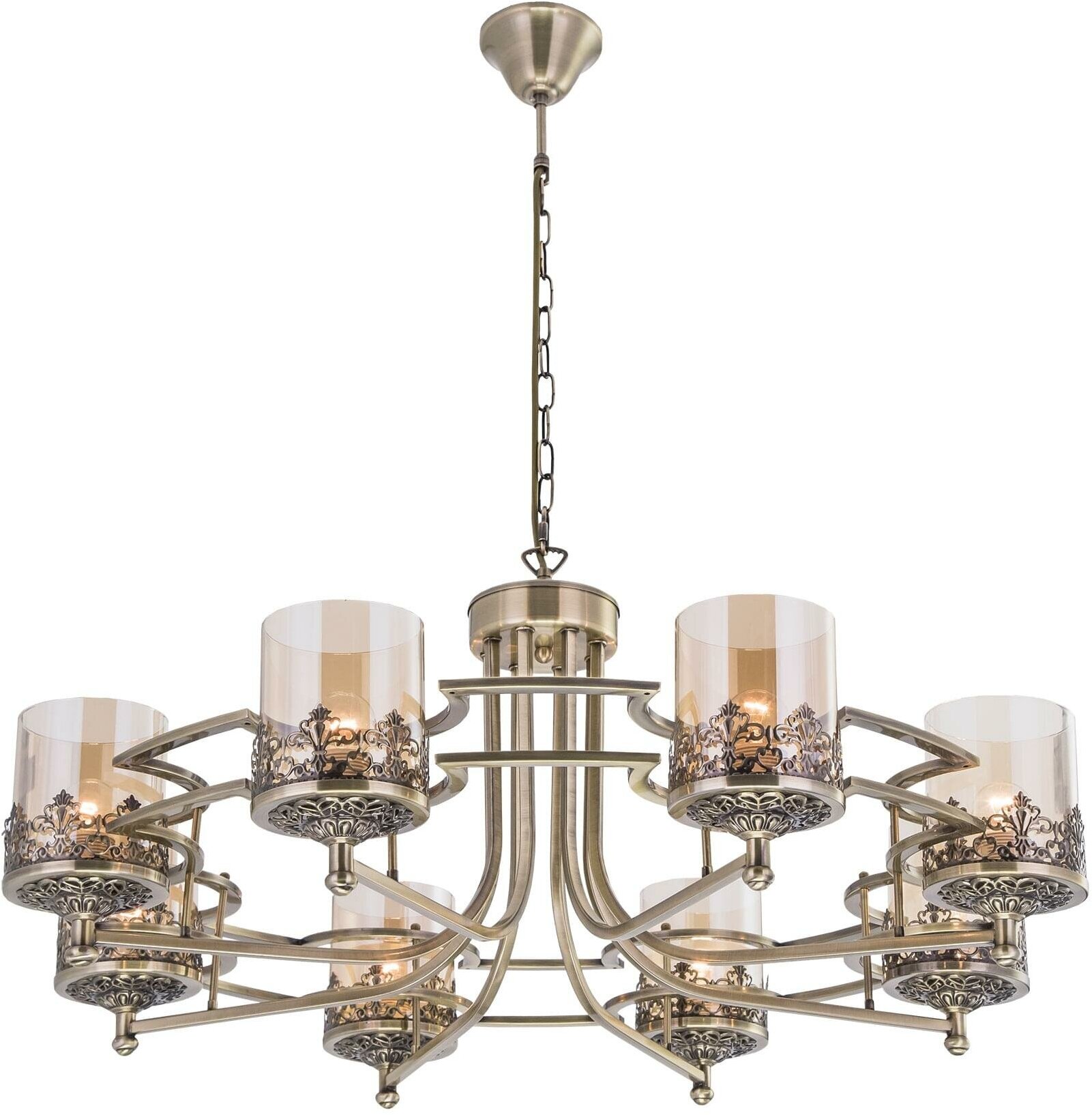 Изящная восьмирожковая люстра с фигурными декоративными элементами выполнена в благородном бронзовом цвете. Ажурное металлическое плетение окаймляет стеклянные цилиндрические плафоны оттенка шампань: это изысканное сочетание по достоинству оценят поклонники классического стиля оформления интерьера. Высота подвеса регулируется за счет изменения количества звеньев цепи. Люстра общей мощностью 375 Вт идеально подойдет для просторной комнаты. Для создания в помещении многоуровневого освещения рекомендуется использовать бра из той же коллекции.
