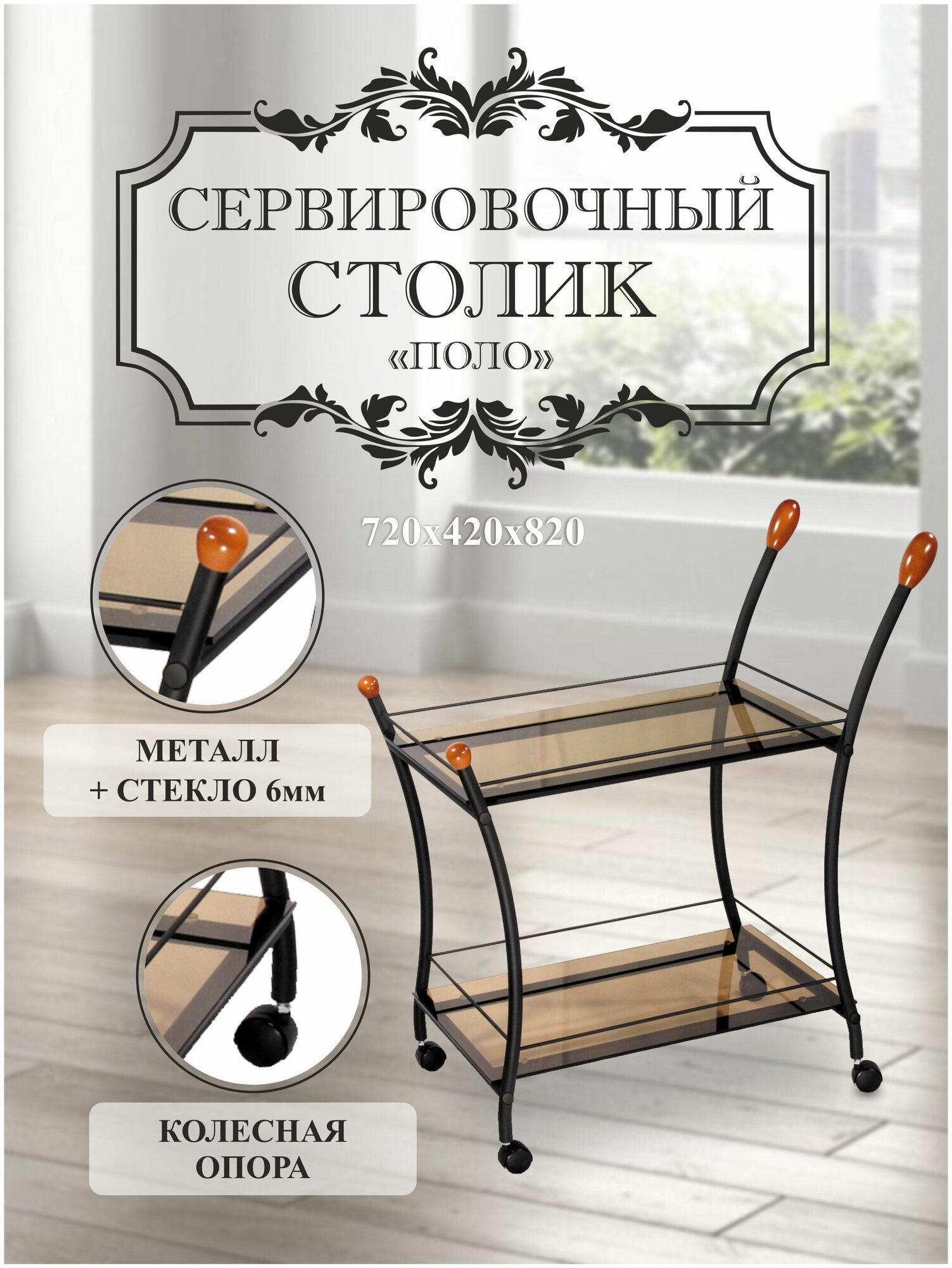 Сервировочный стол Поло позволит с комфортом устроиться для просмотра нового фильма в домашнем кинотеатре: на столешнице и дополнительной нижней полке хватит места для разных закусок, фруктов, бутылки вина, бокалов. Модель также можно использовать в качестве приставного стола во время приема гостей, чтобы расставить не поместившиеся блюда. Поворотные колеса и удобные ручки с пластиковыми насадками обеспечивают мобильность изделия – летний завтрак можно будет подать на открытой веранде. Следует оберегать стекло от слишком горячей посуды, статическая нагрузка на каждую полку не должна превышать 20 кг.