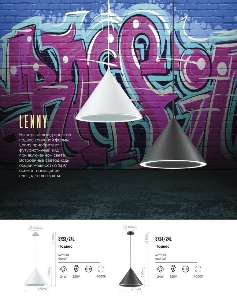 На первый взгляд простой подвес конусной формы Lenny приобретает футуристичный вид при включенном свете. Встроенные светодиоды общей мощностью 18W осветят помещение площадью до 10 кв.м.