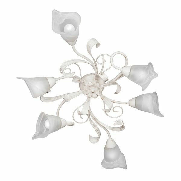 Изящная декоративная люстра привнесет в обстановку спальни или гостиной нежные романтичные ноты. Модель напоминает эффектную флористическую композицию в светлых тонах. Плафоны выполнены в виде цветочных бутонов с фигурными краями из деликатно рассеивающего свет матового стекла. Рожки-стебли и листья – из прочного металла с устойчивым к коррозии и истиранию покрытием. Светильник с изысканным дизайном удачно впишется в интерьеры: прованс, арт-деко, модерн и классический.