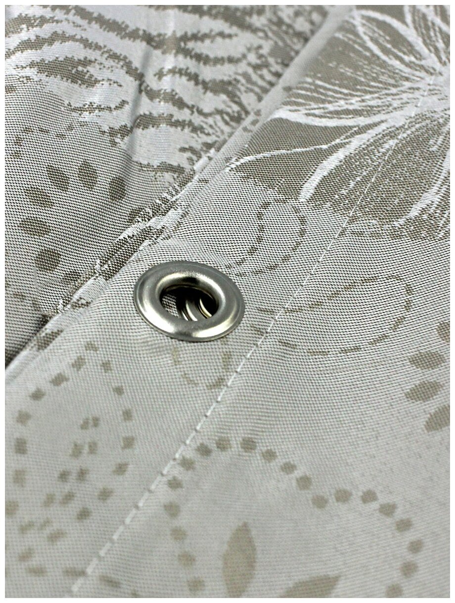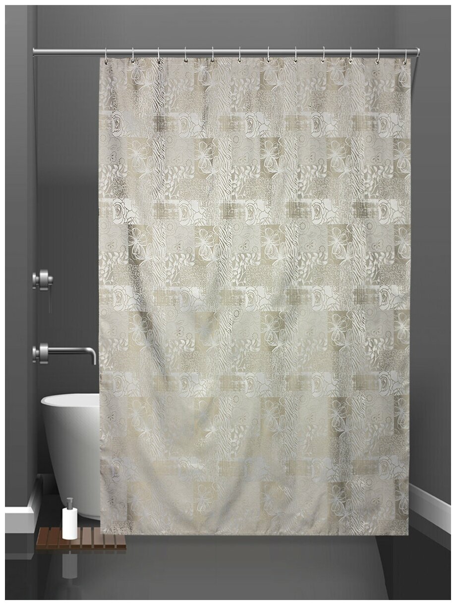 Штора размером 180х200 см с водоотталкивающими свойствами — практичное решение для организации комфортного и функционального пространства в ванной комнате. Изделие выполнено из 100% полиэстера, поверхность имеет фактуру жаккардовой ткани, что подчеркивает рисунок и придает полотну нарядный блеск. Материал приятен на ощупь, отличается высокой износостойкостью и гигиеничностью. Штора не впитывает загрязнения и легко чистится, при необходимости ее можно постирать в автоматической стиральной машине.