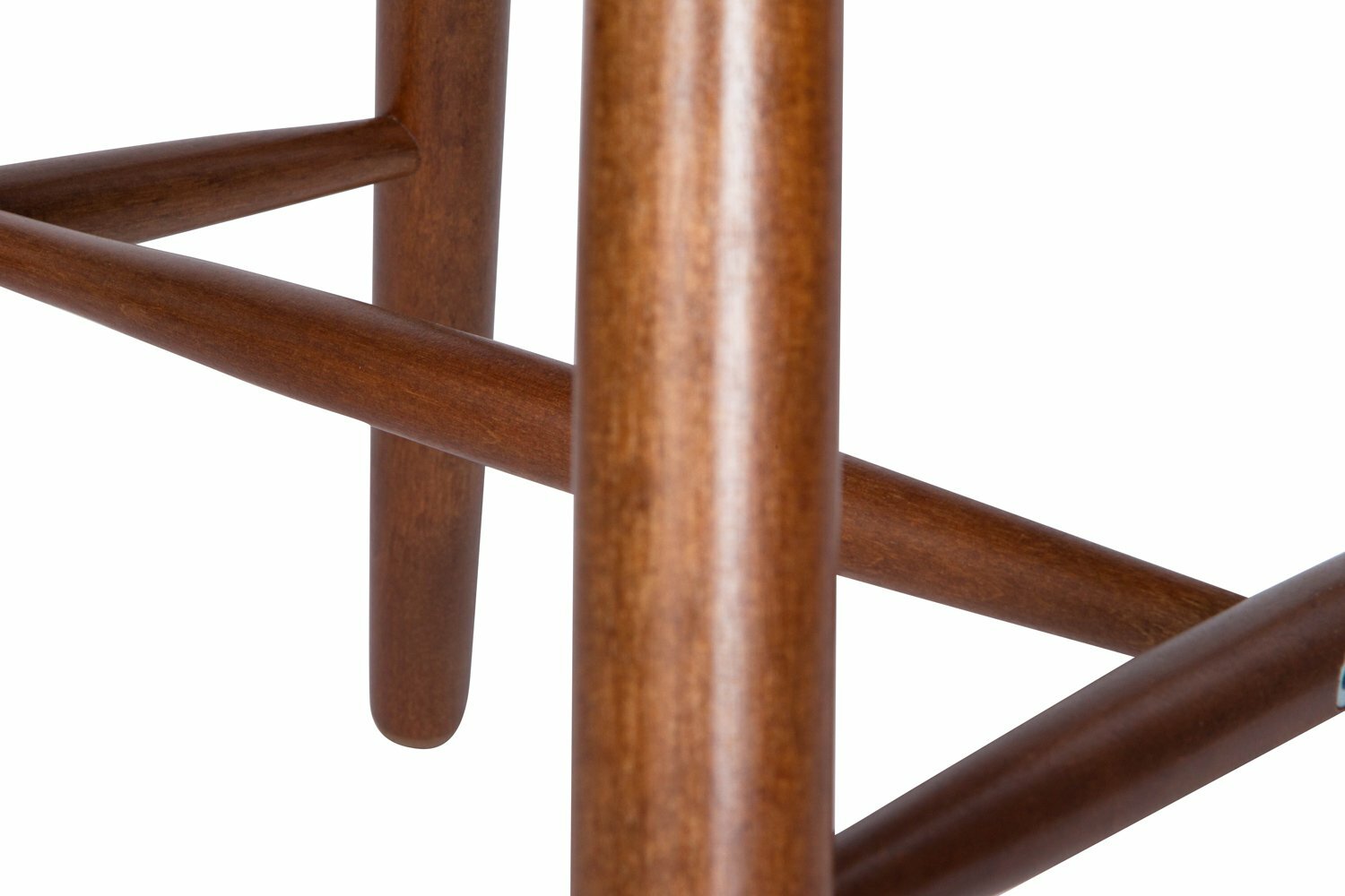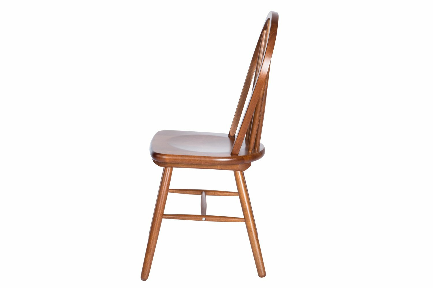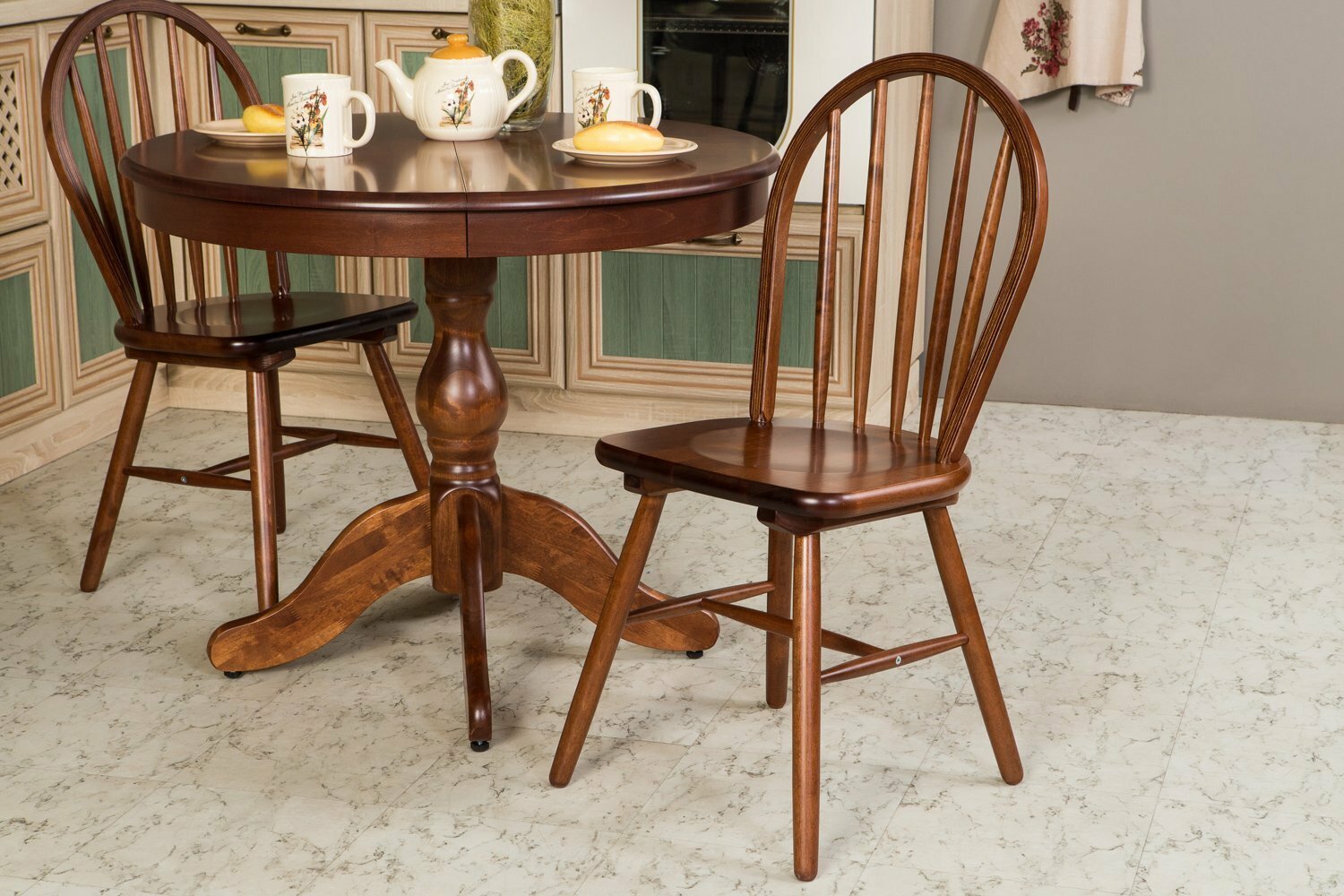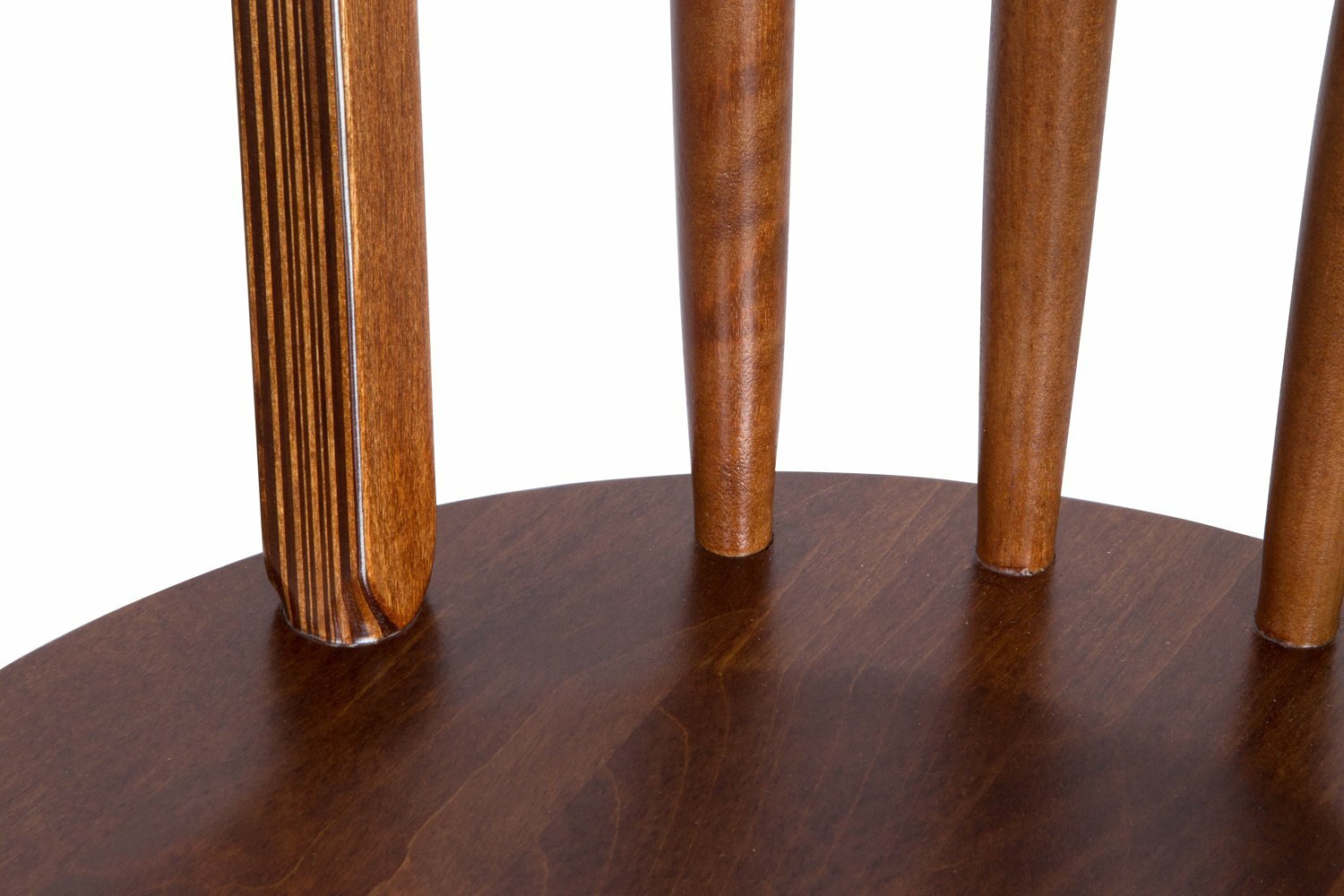 Стул действительно напоминает классическую венскую мебель с характерными гнутыми деревянными деталями и отсутствием углов. Удачно выглядят подковообразная реечная спинка, цилиндрические ножки, оригинально обточенные проножки, которые выполняют функцию ребра жесткости. Повышенное удобство достигается за счет выемки на сиденье. Дополнительную устойчивость придает угол, под которым установлены ножки стула. Модель изготовлена из березы, обработанной под темных орех.