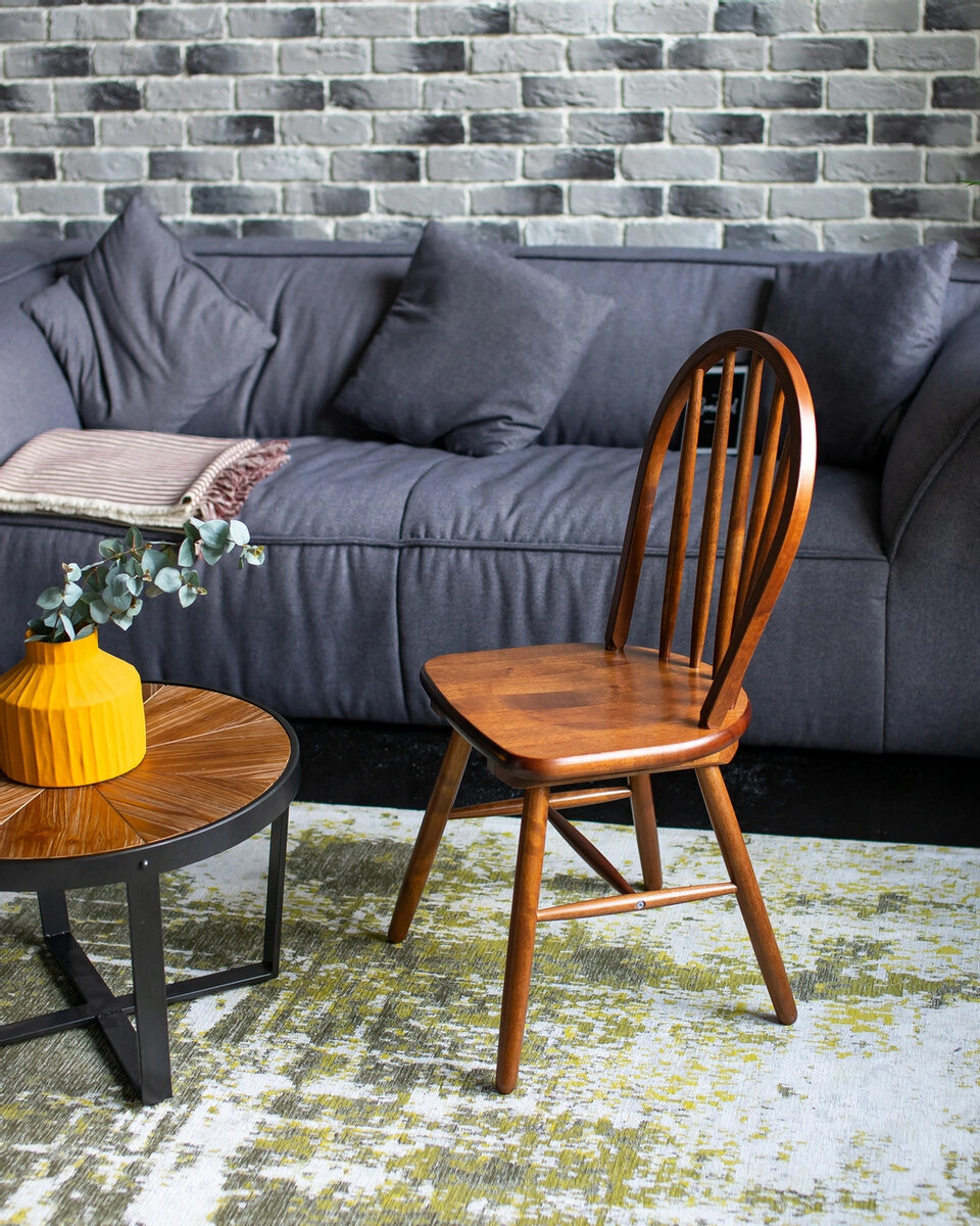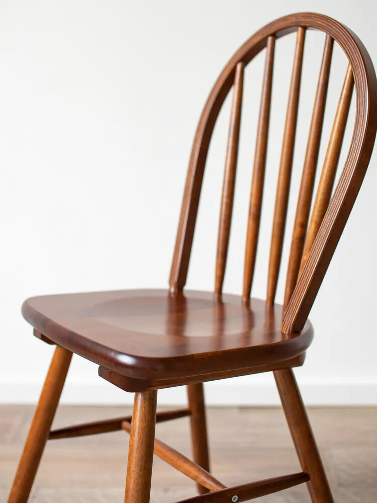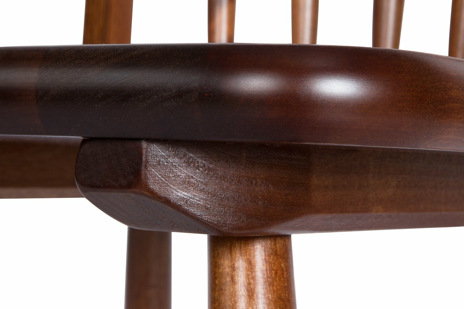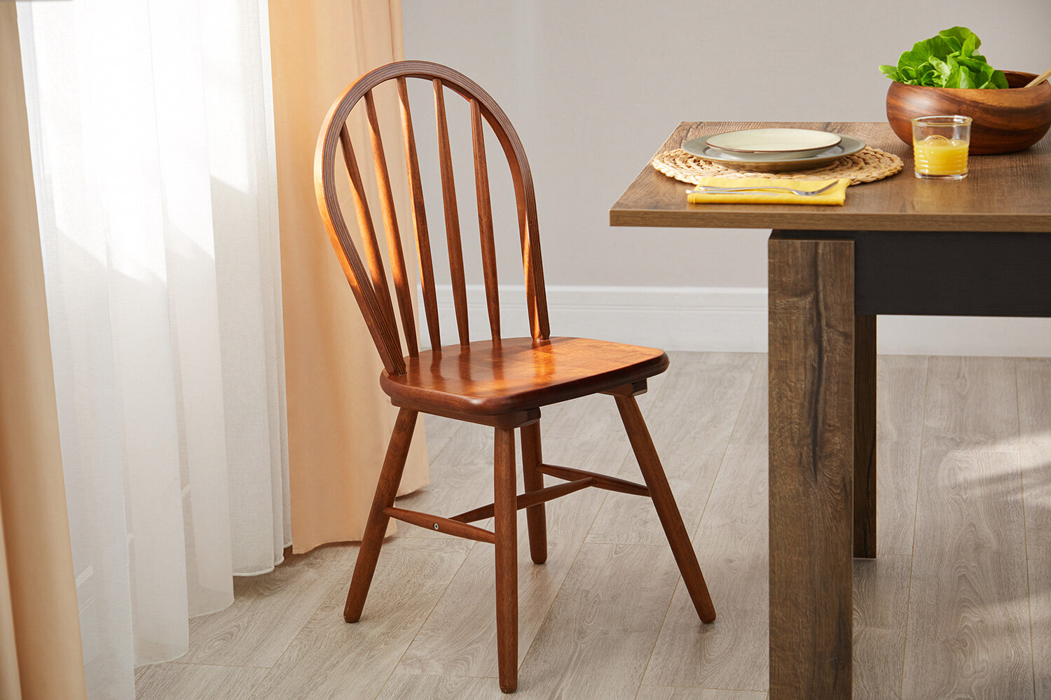 Стул действительно напоминает классическую венскую мебель с характерными гнутыми деревянными деталями и отсутствием углов. Удачно выглядят подковообразная реечная спинка, цилиндрические ножки, оригинально обточенные проножки, которые выполняют функцию ребра жесткости. Повышенное удобство достигается за счет выемки на сиденье. Дополнительную устойчивость придает угол, под которым установлены ножки стула. Модель изготовлена из березы, обработанной под темных орех.