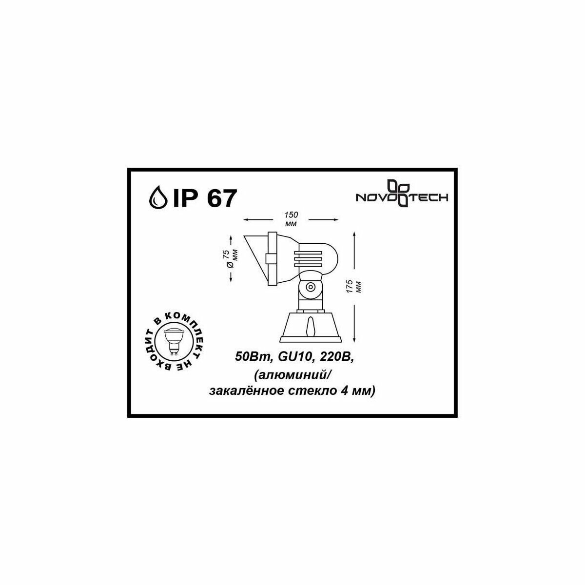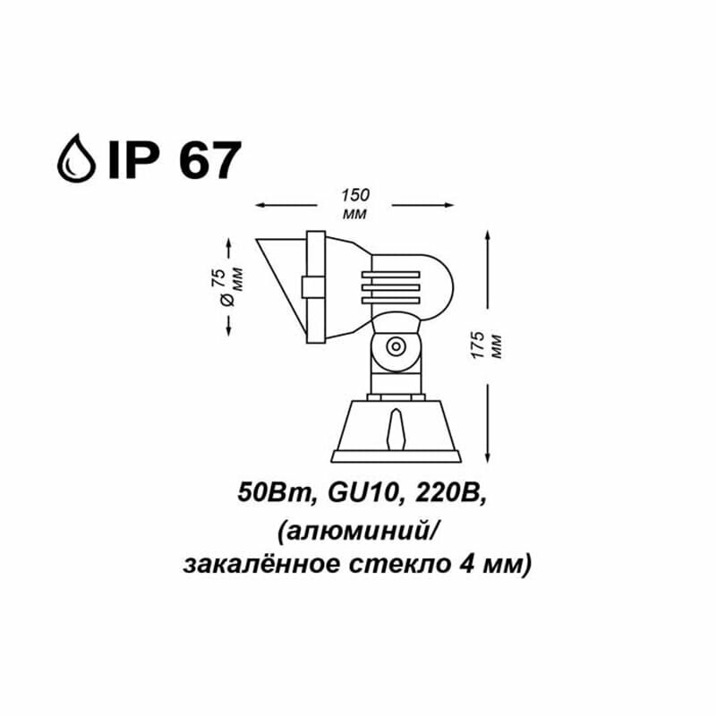 Корпус светильника состоит из алюминия. Это металл, основными достоинствами которого являются — устойчивость к практически всем видам негативного воздействия окружающей среды, коррозии, небольшой вес, по сравнению с другими видами металла и экологическая безопасность материала. Рассеиватель сделан из закаленного стекла. Оно выдерживает температуру от -70 до 250С., а так же в 5-6 раз прочнее обычного. Стакан – пластик. Этот материал имеет высокие эксплуатационные показатели, что объясняется его повышенной стойкостью к механическим повреждениям и защищенностью от факторов внешней среды. Идеально подходит для точного освещения скульптур, растений, деревьев и вывесок или акцентирования архитектурных деталей. Высокая степень защиты. Простота в установке и многократное перемещение (по необходимости).