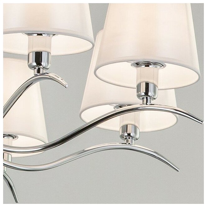Люстра Эмма – изысканное решение для помещений с высокими потолками. Сочетание эффектно изогнутых хромированных рожков и плафонов из светлого текстиля выглядит необычно и элегантно. Благодаря классической форме абажуров электрический свет мягко рассеивается по комнате, равномерно ее освещая. Ткань содержит специальную пропитку, которая не дает пыли и грязи скапливаться на поверхности. Все металлические элементы изделия обладают высокой стойкостью к образованию царапин и сколов.