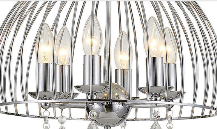 Люстра Джина – эффектное решение для организации освещения в гостиной, отделанной в стиле фьюжн или постмодернизм. Полукруглый плафон, состоящий из металлических прутьев, пропускает много света и отбрасывает интересные тени на потолок и стену. Хрустальные декоративные элементы оживляют всю композицию и красиво искрятся в лучах света. В светильнике минимальное количество деталей, на которых может накапливаться пыль. А оригинальная конструкция позволяет с легкостью менять перегоревшие лампочки.