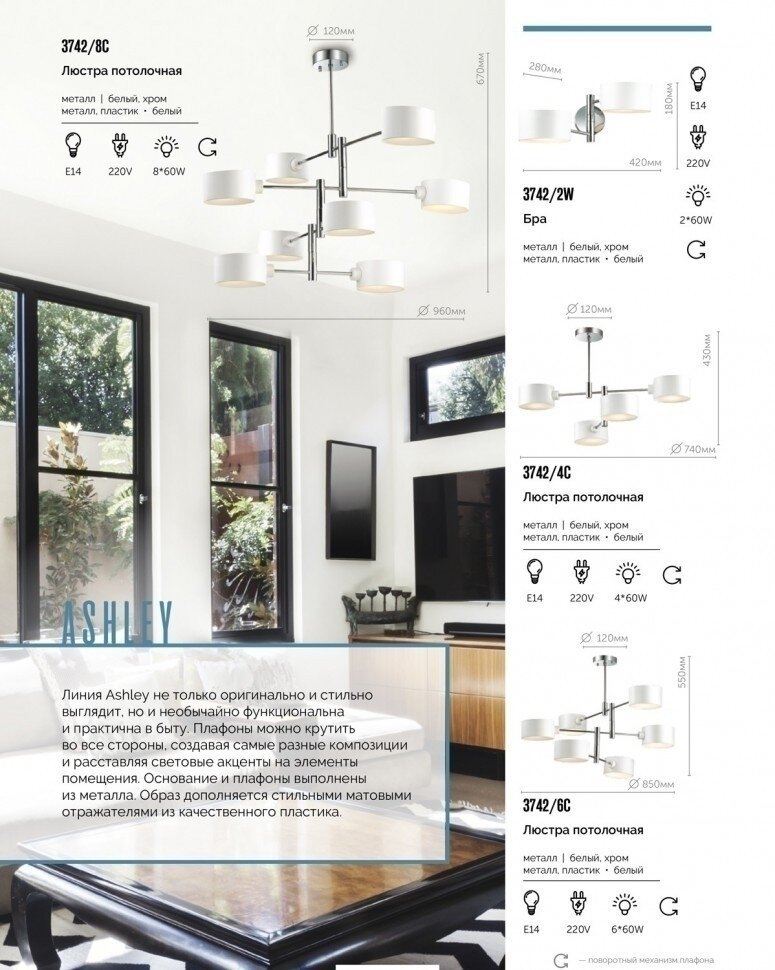 Серия ASHLEY не только оригинально и стильно выглядит, но и необычайно функциональна и практична в быту. Плафоны можно крутить во все стороны, создавая самые разные композиции и расставляя световые акценты на элементы помещения. Основание и плафоны выполнены из металла. Образ дополняется стильными матовыми отражателями из качественного пластика.