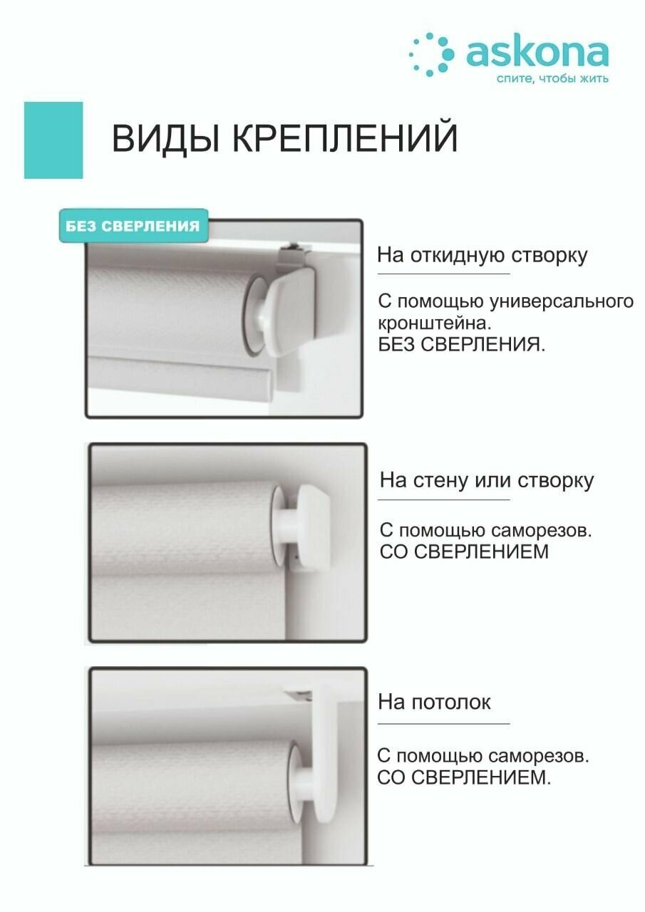 Рулонная штора Askona «Плайн» сделана из прочного полиэстера и обработаны гипоаллергенным пылеотталкивающим составом. Плотная ткань не выцветает и пропускает свет всего на 10-30%. Такая продукция может также называться: роллета, рольштора, рулонные жалюзи, тканевая роллета. Благодаря универсальной конструкции крепить рулонную штору можно без сверления на откидную створку окна. Возможна установка саморезами: на стену, потолок, глухие створки, в проём, нишу, на деревянные или пластиковые рамы. Уход за шторой: по мере необходимости используйте пылесос с мягкой щёткой или влажную губку с мягким моющим средством (не рекомендуем стирать, отбеливать или гладить штору, а также использовать агрессивные моющие средства). В ассортименте представлены различные цвета и размеры.