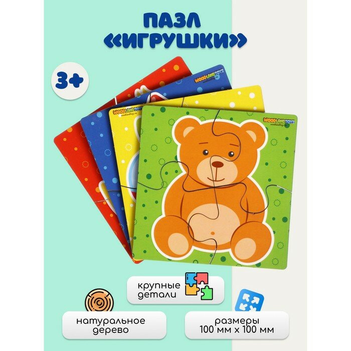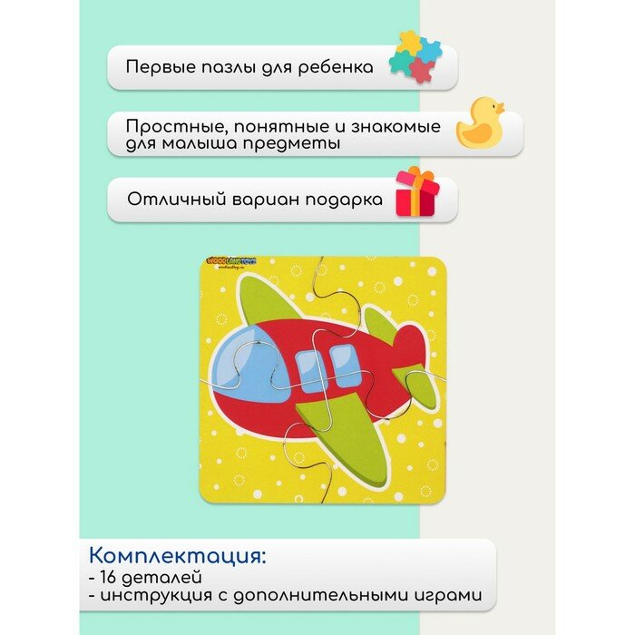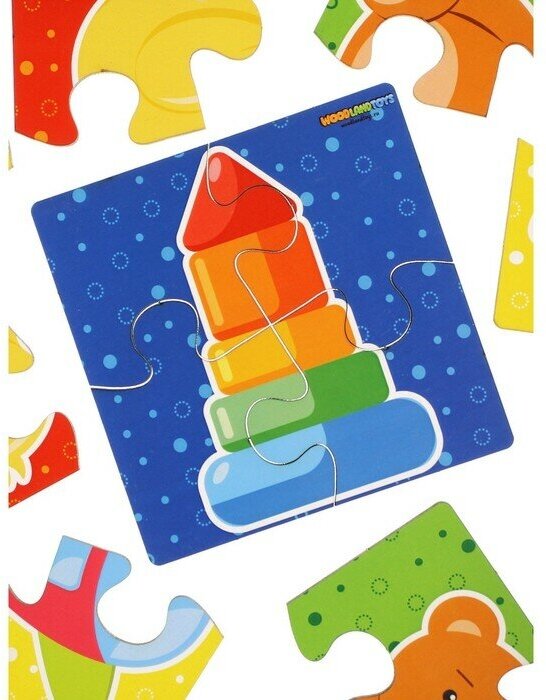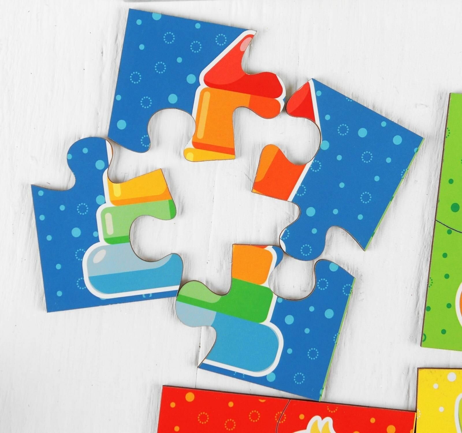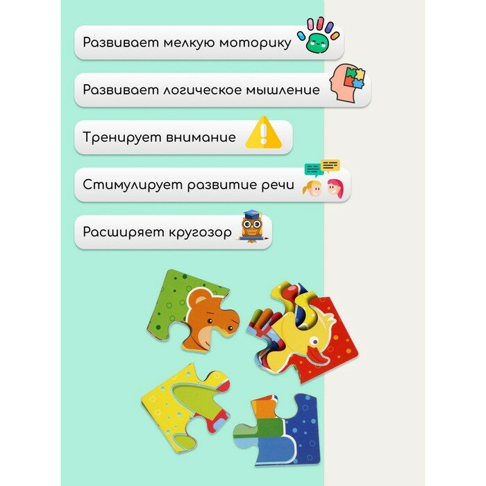 Пазл для малышей – это развивающая игрушка - головоломка, которая учит воспринимать связь между целой картинкой и ее частями для самых маленьких детей. Ваш малыш с удовольствием будет рассматривать яркие тематические изображения пазлов и пробовать соединять замысловатые детали между собой. Терпение и небольшая помощь взрослого очень быстро принесут свои плоды, ребенок научится собирать замечательные картинки, которые состоят из 4 деталей. В комплекте ребенок найдет сразу 4 варианта пазлов, что, несомненно, разнообразит его деятельность и поможет в развитии мелкой моторики, мышления, воображения, тактильного и зрительного восприятия.