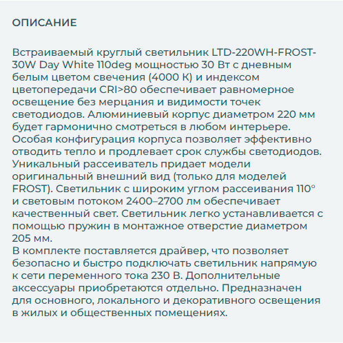| Дополнительные характеристики | Встраиваемый круглый светильник, угол 110° / 30Вт / ДНЕВНОЙ БЕЛЫЙ 4000K / светодиод 1x30W / 2400-2700 лм, CRI>80. Белая лицевая панель. IP44. Питание AC110-240V, 30Вт, 700mA 39-47V, драйвер в комплекте. Размеры DxH220х65мм, отверстие для установки 205мм |