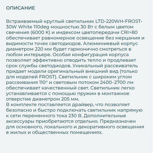 | Дополнительные характеристики | Встраиваемый круглый светильник, угол 110° / 30Вт / БЕЛЫЙ 6000K / светодиод 1x30W / 2400-2700 лм, CRI>80. Белая лицевая панель. IP44. Питание AC110-240V, 30Вт, 700mA 39-47V, драйвер в комплекте. Размеры DxH220х65мм, отверстие для установки 205мм. |
