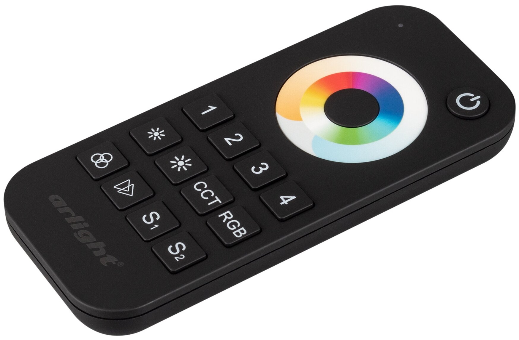 | Дополнительные характеристики | кнопочный радиопульт с сенсорным кольцом 2.4 ГГц черного цвета для управления DIM/MIX/RGB/RGBW источниками света. 4 зоны управления, 2 слота памяти пользовательских настроек, выбор цвета и типа управления с помощью сенсорного кольца. Питание 3VDC (AAA*2) |