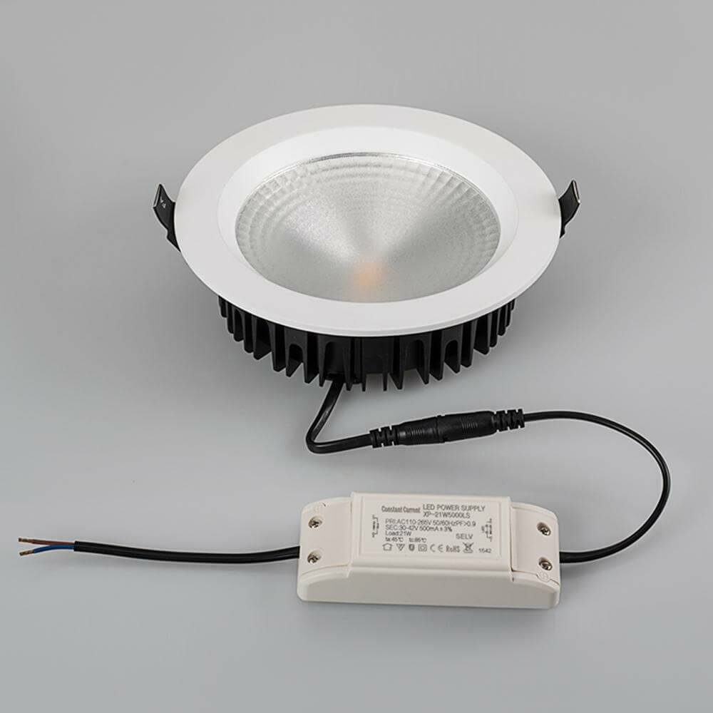 | Дополнительные характеристики | Встраиваемый круглый светильник, угол 110° / 21Вт / ДНЕВНОЙ БЕЛЫЙ 4000K / светодиод 1x21W / 1680-1890лм, CRI>80. Белая лицевая панель. IP44. Питание AC110-240V, 21Вт, 500mA 38-46V, драйвер в комплекте. Размеры DxH187х58мм, отверстие для установки 160мм. |