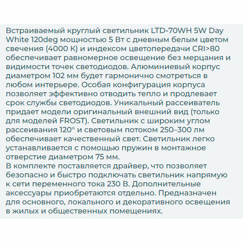 - Светодиодный светильник LTD-70WH 5W Day White 120deg (Arlight, IP40 Металл, 3 года) Арт.018040