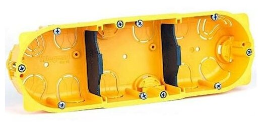 Инновационная коробка монтажная диаметром 67 мм, шириной 73 мм, длиной 213 мм 080043 марки Legrand применяется для монтажа электроустановочных изделий в гипсокартонные стены. Надежный материал - пластик, в цвете - желтый из которого сделана коробка, гарантирует продолжительную работу инструмента. Установочная глубина изделия - 38 мм, фиксация осуществляется на винт и распорные лапки, кабельный ввод - ступенчатая мембрана. Модель соответствует коду EC002601 (Материалы для подключения) в классификаторе ETIM, относится к группе "Распределительная коробка/корпус для монтажа в стене и в потолке".
