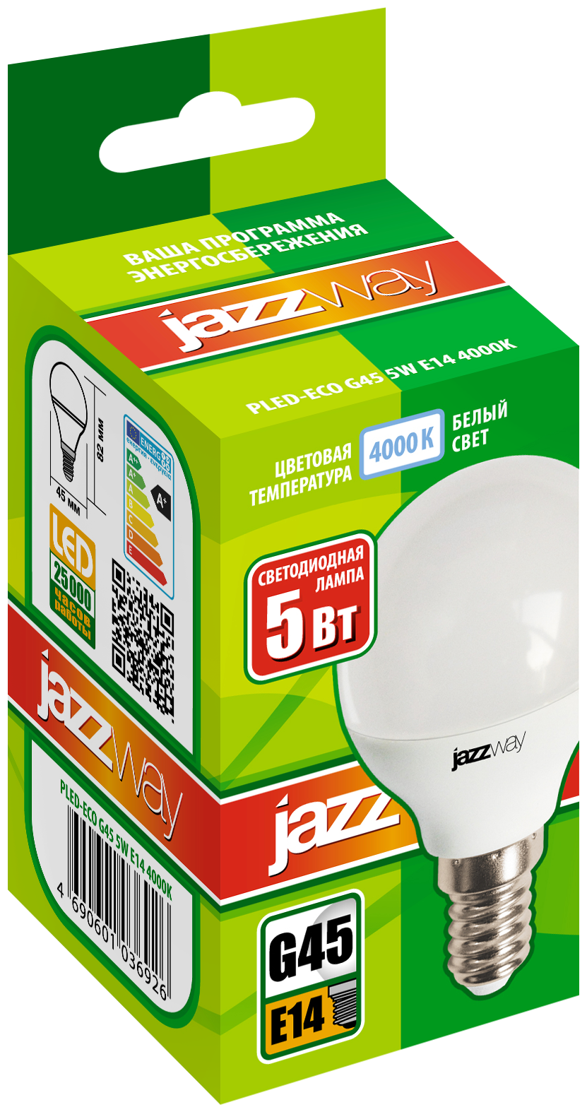 1036926A Лампа светодиодная (LED) G45 "шар" 5W E14 4000K мат 400Lm Jazzway PLED- ECO