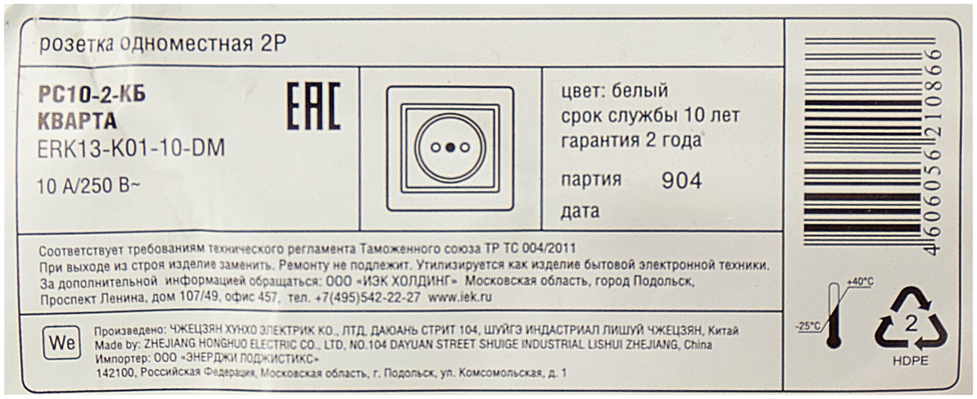 ERK13-K01-10-DM РС10-2-КБ Розетка 1местн. без з/к без защ.штор. 10А КВАРТА (белый) Упаковка (10 шт.) IEK