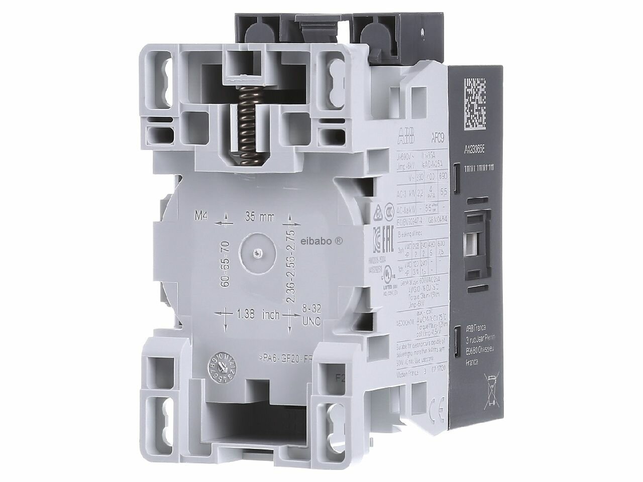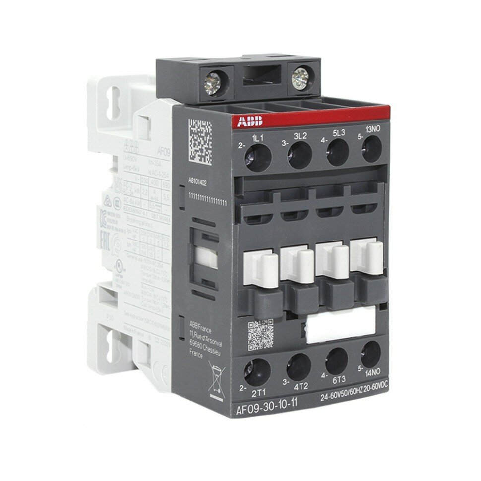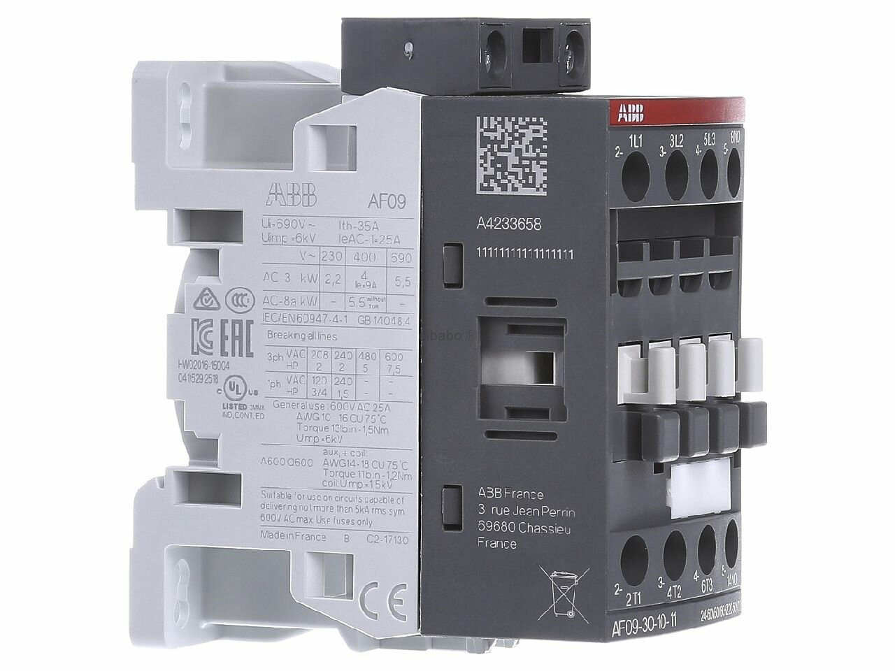 Контактор AF09-30-10-11 представляет собой 3-х полюсный контактор, предназначенный для управления трехфазными электродвигателями и силовыми цепями при напряжении до 690 Вольт. Данная модель имеет универсальную катушку с электронным управлением, работающую при диапазонах напряжении 24-60 Вольт. Номинальный ток нагрузки при пуске электродвигателей: 9 Ампер. Номинальный ток нагрузки в электроцепях сопротивления - 25 Ампер. Контактор имеет 3 нормально-открытых основных контакта и 1 нормально-закрытый дополнительный контакт. Номинальная рабочая мощность контактора - 4 кВт. Имеет пониженное энергопотребеление, встроенный ограничитель перенапряжения и широкий выбор других аксессуаров. Есть возможность установки дополнительных вспомогательных контактов для фронтального или бокового монтажа. Рабочая температура контактора от -60°C до +80°C.