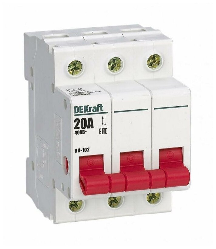 Выключатель-разъединитель серии ВН-102 DEKraft; 3P; номинальный ток 20 А; установка – на DIN-рейку; установочное положение - любое. Выключатели-разъединители применяются для ручного включения/отключения сетей напряжением до 400 В. Специальные мостиковые контакты обеспечивают надежный разрыв цепи; они полностью исключают возможность перекрытия дугой по изоляции. Усиленная рукоятка управления обеспечивает большое количество включений/отключений.