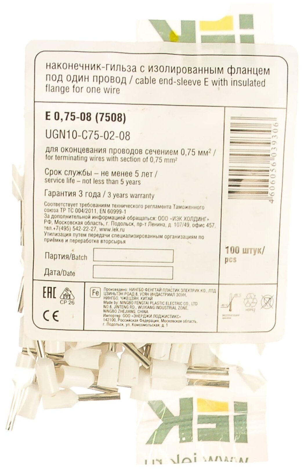 UGN10-C75-02-08 Наконечник-гильза Е7508 0.75 мм² (белый100 шт) IEK