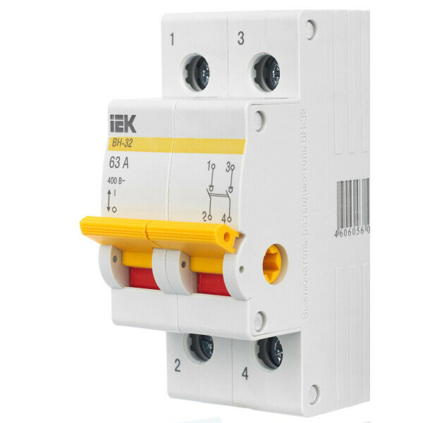 Выключатель IEK ВН-32 2Р MNV10-2-063, ток 63A, полюсов 2П, напряжение 400В, ширина 2мод, белый в упаковке 1шт