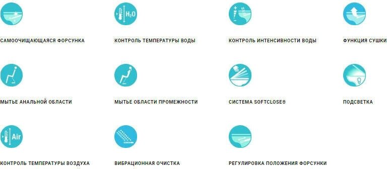 | Дополнительные функции биде | крышка-сиденье с функцией биде,настройка режимов биде,регулировка температуры воды биде,регулировка напора воды в биде,термостат,регулировка температуры фена,маятниковый режим движения штуцера,настройка положения штуцера,самоочищающийся стержень для гигиенического омывания |