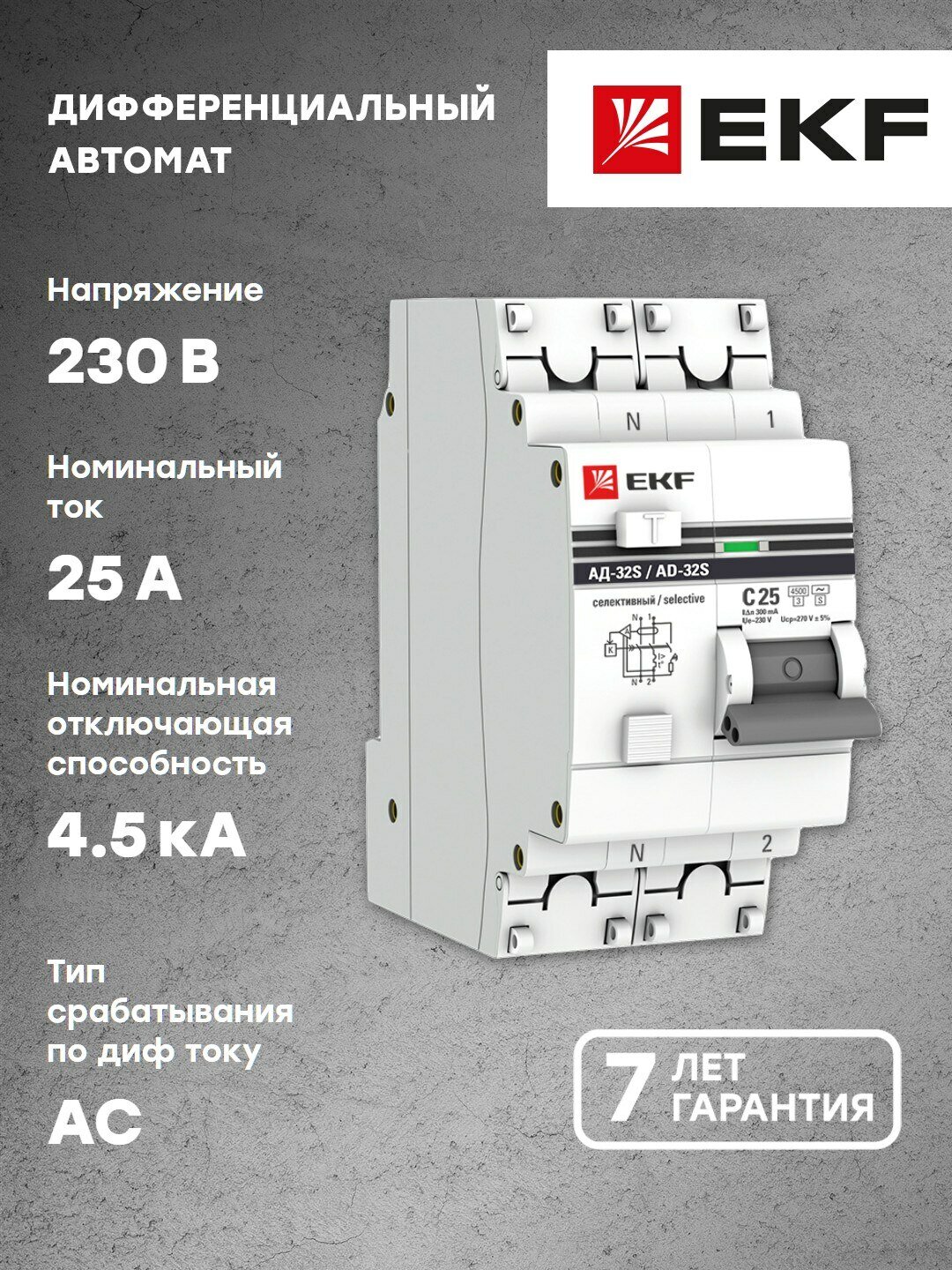 Дифференциальный автоматический выключатель EKF PROxima АД-32, селективный, 1P+N, 25А, С, 300мА предназначен для защиты людей от поражения электрическим током при случайном прикосновении к открытым проводящим частям электроустановки, защиты электроустановки (ЭУ) при повреждении изоляции проводников и неисправностях ЭУ, предотвращения возгораний и пожаров, возникающих вследствие протекания токов утечки и развивающихся из них коротких замыканий, замыканий на корпус и замыканий на землю, автоматического отключения участка электрической сети при перегрузках и токах короткого замыкания. Применяется в электрических цепях переменного тока номинального напряжения 230В/400В и частотой 50 Гц бытового и промышленного назначения. АД 32S (селективный) специально предназначен для выдержки заранее установленного значения предельного времени неотключения, при протекании дифференциального тока.