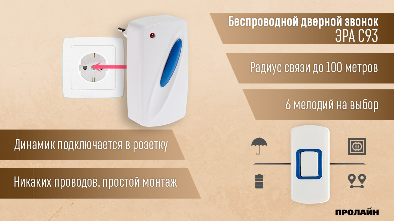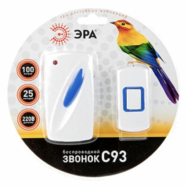 О товареЭра С93 используется в качестве переносного беспроводного дверного звонка или сигнала вызова. Кнопка крепится на двустороннюю клейкую ленту или саморезы. Установка возможна в любом помещении где есть стандартная европейская розетка, сопряжение двух частей происходит автоматически, если вы уходите в другое помещение, можете взять часть с динамиком с собой и включить её там. Как это работает?Для подключения части с динамиком подойдёт любая стандартная розетка, данный вариант особенно интересен если у вас нет постоянно места расположения для динамика ЭРА С96. Поскольку настройка не требуется можно переносить звонок между розетками внутри помещения, при включении он сразу готов к работе. Радиус связи составляет до 100 м, благодаря этому можно не волноваться за передачу сигнала вызова на достаточно большом расстоянии. Кнопка может быть расположена на улице, она защищена от брызг воды, есть возможность сделать надпись с номером квартиры или другой информацией. Можно выбрать из 6 простых мелодий, а при 20 срабатываниях в день комплектной батарейки А23 (12 В) должно хватит примерно на год работы.Особенности Свободное размещение внутри помещения, дистанция до кнопки до 100 м. Уникальный код каждого комплекта исключает ложные срабатывания. Динамик вставляется в любую розетку, не требует установки вообще. Батарейка для кнопки прослужит около года или больше. Кнопка защищена от влаги по стандарту IP44. Шесть простых мелодий на ваш выбор. Технические характеристики Основное Цвет белый с синей вставкой динамика и кнопки Дальность действия до 100 м (в условиях прямой видимости) Количество мелодий 6 простых мелодий Количество подключаемых динамиков 1 поставляется в комплекте Рабочая частота 433.92 МГц Подключение нескольких кнопок только комплектная Питания динамика звонка от сети 220 В Элементы питания кнопки 1хA23 (в комплекте) Класс защиты звонка IP20 (защита от попадания крупной пыли) Класс защиты кнопки IP44 (защита от попадания пыли и брызг воды) Материал корпуса ABS-пластик Тип крепления кнопки двусторонняя клейкая лента или шурупы Светодиодная индикация есть Автообучаемый код нет Регулировка громкости нет Общее Диапазон рабочих температур от -20° до +50°C Относительная влажность не более 80% Условия хранения не требует особых условий хранения Размер кнопки 75x36x20 мм Размер звонка 100x54x66 мм (с вилкой) Комплектация Звонок - 1 шт. Кнопка звонка – 1 шт. Батарейка A23 – 1 шт. Монтажный комплект - 1 шт.
