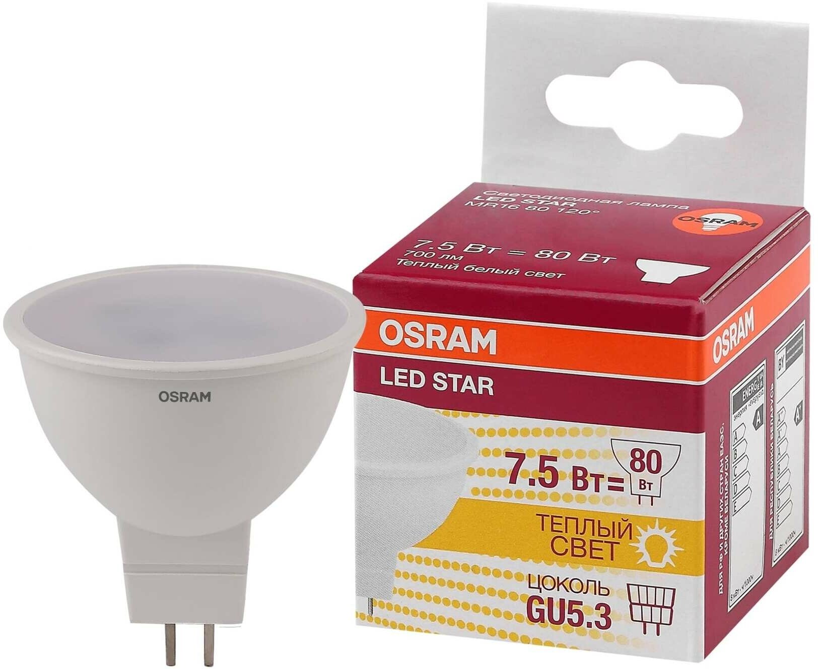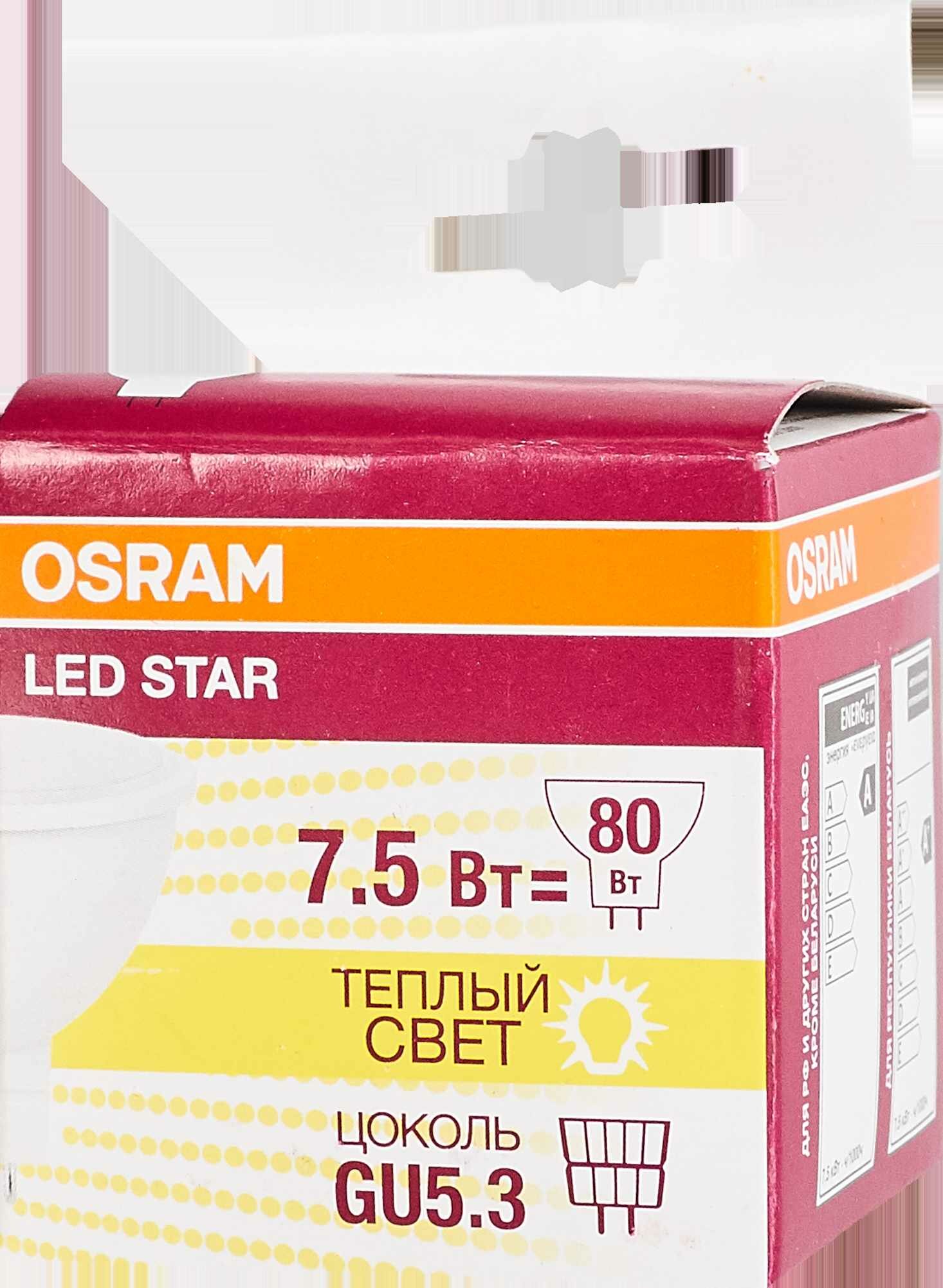 Лампа светодиодная LED 7.5Вт GU5.3 MR16 110° (замена 80Вт) тепло-бел Osram (4058075229068)