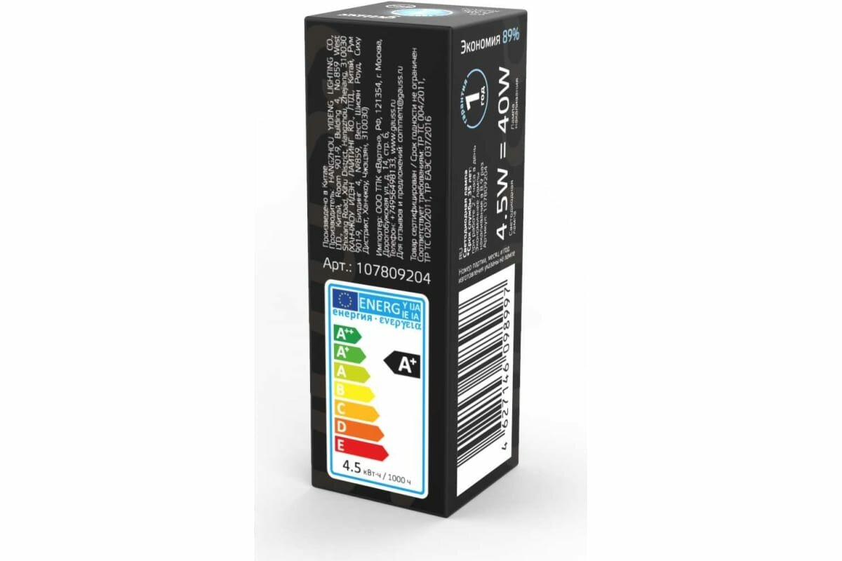 | Эквивалент лампы накаливания (Вт) | 40 |