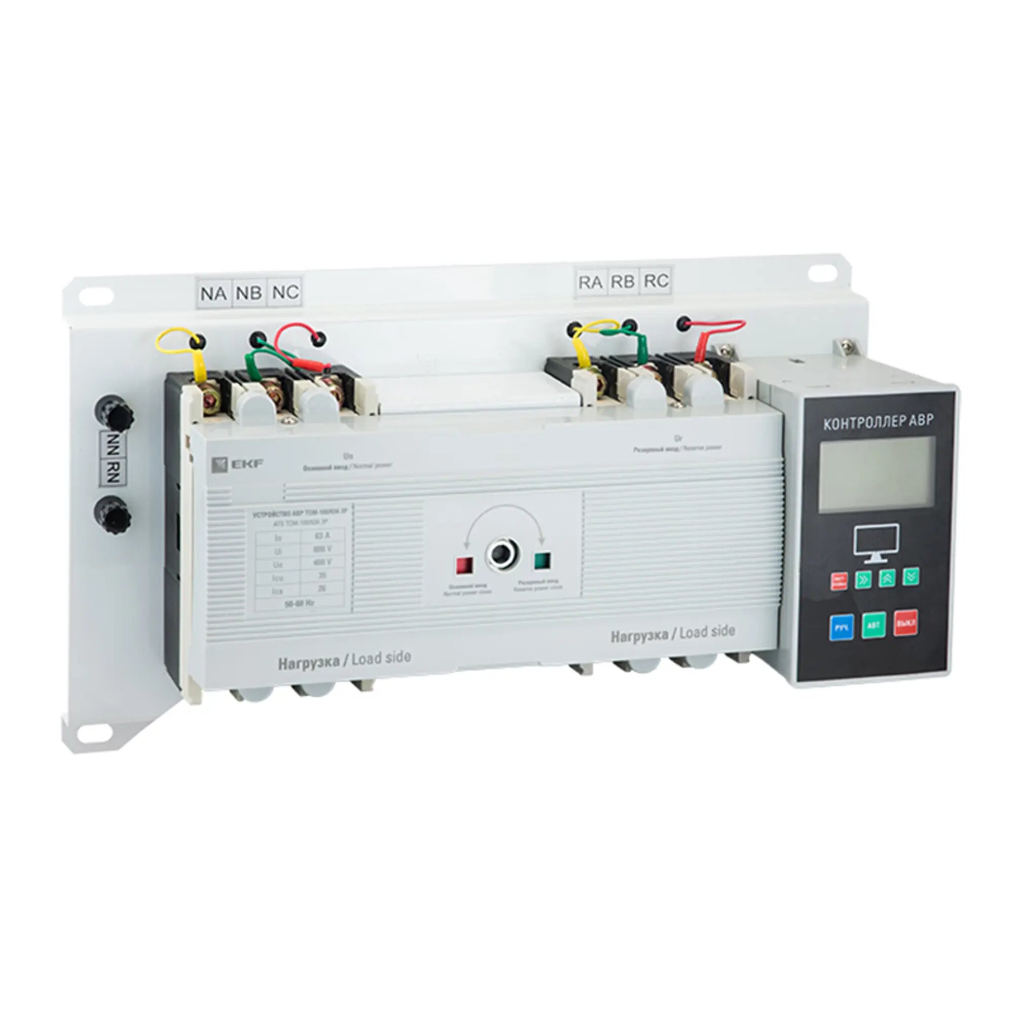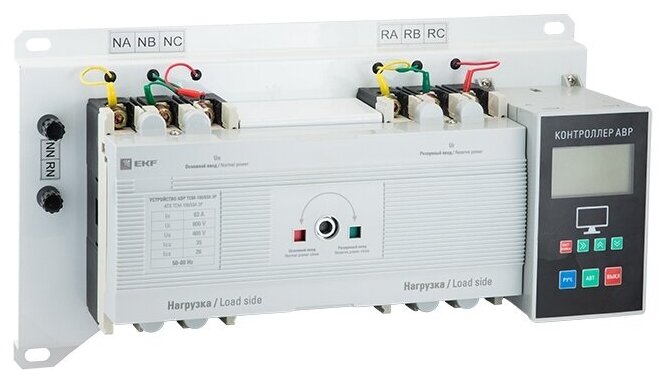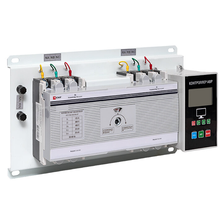 ОПИСАНИЕ. Устройство АВР TCM EKF PROxima предназначено для обеспечения резервным электроснабжением нагрузки, подключенной к системе электроснабжения, имеющей основной и резервный вводы. Устройство АВР автоматически подключает резервную линию питания в случае пропадания напряжения на основной линии. Устройство АВР ТСM EKF PROxima предназначено для обеспечения резервным электроснабжением нагрузки, подключенной к системе электроснабжения, имеющей основной и резервный вводы. Устройство АВР автоматически подключает резервную линию питания в случае пропадания напряжения на основной линии. Также устройство АВР ТСM имеет функцию защиты от токов перегрузки и коротких замыканий распределительных сетей и электродвигателей. Устройство АВР ТСM может быть настроено на несколько программ переключения. А) Питающие линии: электросеть – электросеть: автоматическое переключение на резервную электрическую линию при выходе параметров основной питающей электрической линии за установленные пределы, автоматический возврат с резервной линии на основную после восстановления параметров основной линии в установленные пределы. Установка времени задержки переключения между электрическими линиями; автоматическое переключение на вторую электрическую линию при выходе параметров первой питающей электрической линии за установленные пределы, без автоматического возврата со второй линии на первую после восстановления параметров первой линии в установленные пределы. Переключение на первую линию происходит автоматически после выхода параметров второй питающей электрической линии за установленные пределы. Установка времени задержки переключения между электрическими линиями; ручное переключение между питающими электрическими линиями. Б) Питающие линии: электросеть – генератор: автоматическое переключение на резервный генератор линии при выходе параметров основной питающей электрической линии за установленные пределы, автоматический возврат с генератора на основную после восстановления параметров основной линии в установленные пределы. Установка времени задержки переключения между электрическими линиями; ручное переключение между питающими электрическими линиями. Конструкция и основные функции: Устройство АВР выполнено в виде моноблока и состоит из контактного блока, блока управления и двух силовых автоматических выключателей в литом корпусе. На блоке управления имеется рычаг ручного переключения. Такая конструкция позволяет уменьшить высоту и площадь установки АВР.