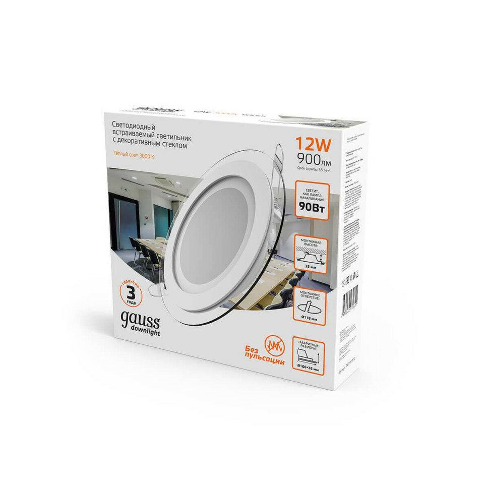 947111112 Светильник круглый с декоративным стеклом160х30 Ø118 12W 3000K 900лм 1/40 Gauss
