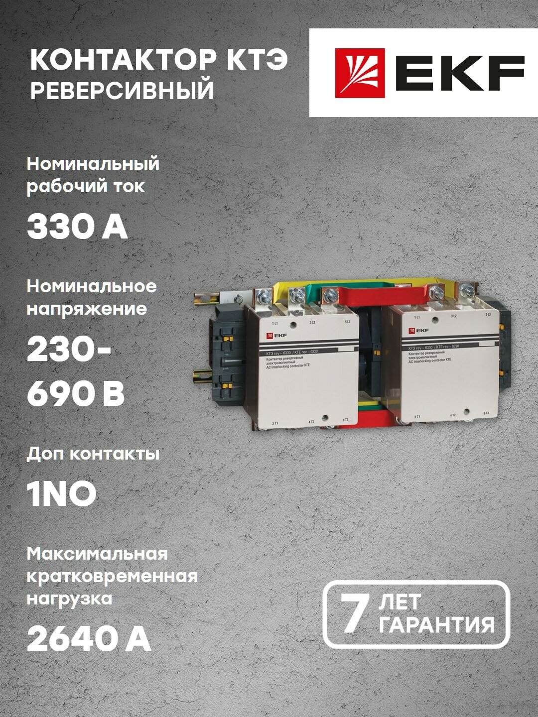 ОПИСАНИЕ. Контакторы КТЭ EKF PROxima состоят из корпуса, закрепленных в нем неподвижных контактов, подвижных контактов, которые закреплены в подвижной части магнитной системы. Неподвижная часть магнитной системы закреплена жестко в корпусе КTЭ. Пружина препятствует смыканию контактов. При подаче напряжения на катушку управления в магнитной системе контактора возникает магнитное поле, которое, преодолевая сопротивление пружины, смыкает магнитную систему и замыкает контакты. При отключении напряжения с катушки управления пружина размыкает контакты. Реверсивная схема КТЭ EKF PROxima представляет собой два контактора КТЭ EKF PROxima, смонтированных на двух направляющих, между контакторами расположена механическая блокировка, препятствующая одновременному включению двух контакторов. Клеммы контакторов соединены соответствующими шинами. Контактор серии КТЭ EKF PROxima награжден медалью международной выставки «Электро-2008» в номинации «Лучшее электрооборудование». ПРЕИМУЩЕСТВА. Реверсивная схема уже в сборе. Повышенное быстродействие – увеличение срока службы. Меньшее переходное сопротивление, уменьшенные тепловые потери на полюсе – увеличенный срок службы. Рекомендуем использовать электронное реле защиты двигателя МРТ. Собственный участок сборки позволяет максимально быстро поставить нужную катушку для клиента. Возможность установки двух дополнительных устройств. Высокая коммутационная износостойкость – главные контакты из тугоплавкого композита с серебром. Широкий ассортимент номинальных токов. Тепловые реле до 200 А. Мостиковый контакт. Быстрое гашение дуги. Простота замены катушки управления. ПРИМЕНЕНИЕ. Промышленность: Включение/отключение технологических машин и оборудования, в том числе высокодискретных автоматических линий, решения для управления и автоматизации. Управление подъемными механизмами. Включение/отключение освещения: производственного, уличного, офисного, коммерческих объектов. Коммутация различных механизмов в сфере ЖКХ, коммерческой недвижимости и производственных помещениях (насосные станции, станции управления электродвигателями, вентиляция, автоматические ворота и двери), ВРУ.