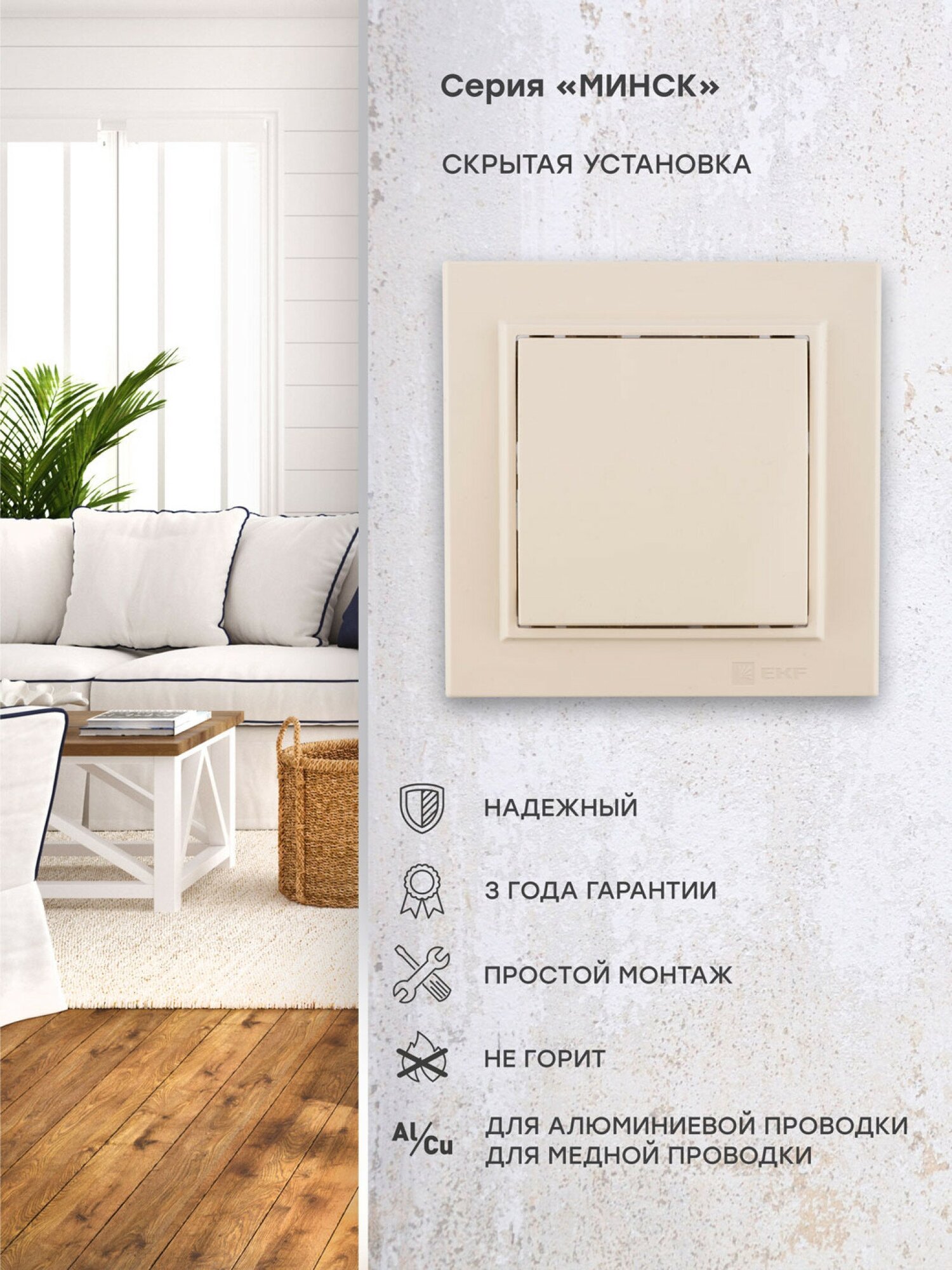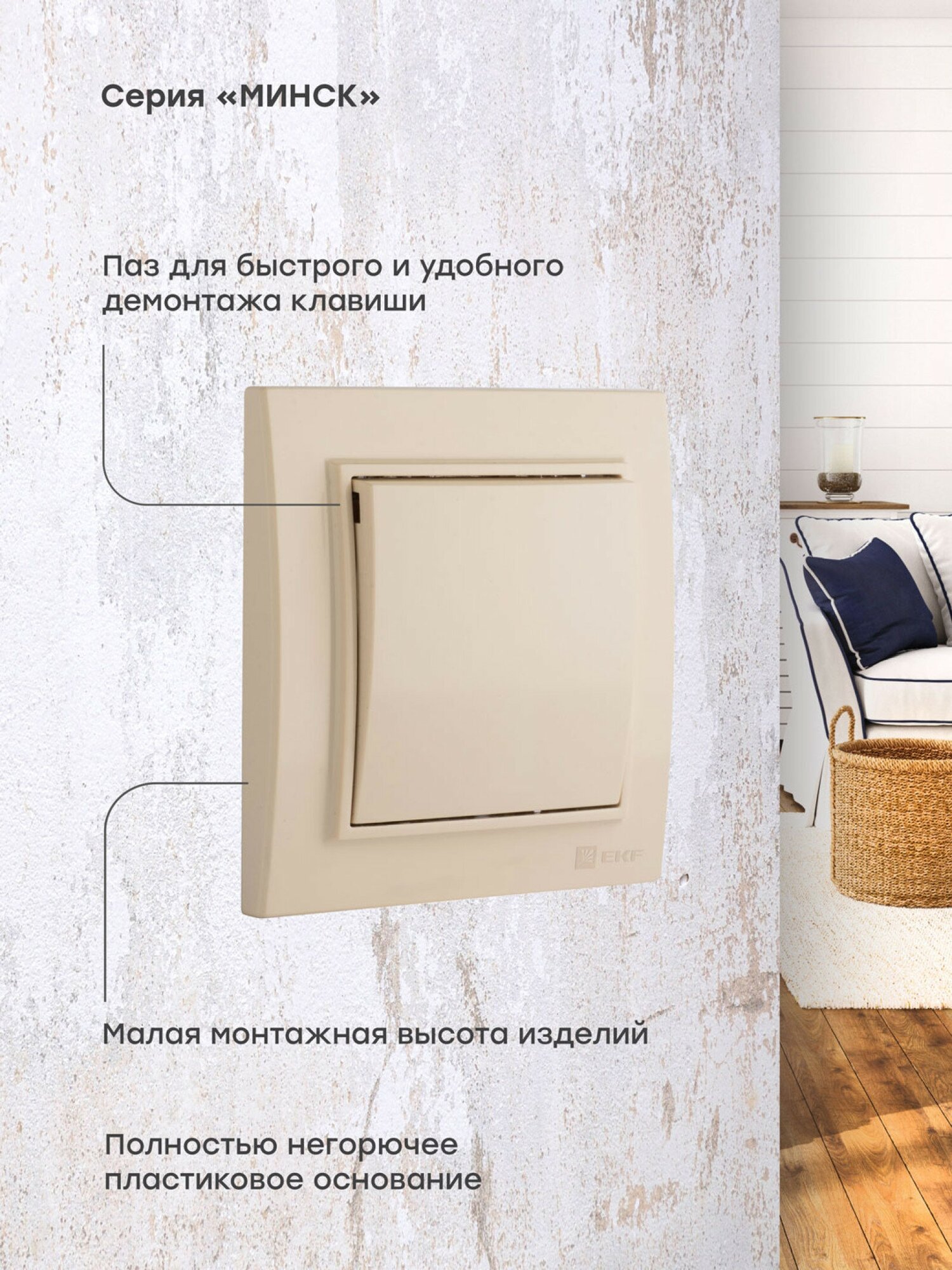 Выключатель 1-клавишный EKF Минск 10А бежевый. Специально разработана для комплексного обеспечения различных объектов строительства электроустановочными изделиями. Выбор данной серии позволит при сохранении высоких стандартов качества и безопасности существенно сэкономить бюджет. Конструкция и материалы специально оптимизированы для надежной и долговечной службы изделий, быстрого и удобного монтажа. Представлена механизмами как скрытой так и открытой установки.Выключателем называется коммутационное устройство, отвечающее за замыкание/размыкание электрической цепи, питающей осветительный прибор. Он всегда устанавливается в участок разрыва фазного провода. Бытовые модели выключателей предназначены для работы с проводкой, использующей нормативную нагрузку.Способ установки выключателяУстройство может быть установлено различными способами, исходя из этого их делят на два типа.- Накладные приборы. Так называются выключатели, которые накладывают на поверхность стены и закрепляют. Они характерно выступают над стеной, что может выглядеть не совсем эстетично. Накладные устройства чаще используются при монтаже внешней проводкой, но могут быть подключены и к скрытой.- Встроенные выключатели. Коммутаторы устанавливаются в подходящую по размеру полость, заранее выполненную в стене. Это значительно усложняет их монтаж, но улучшает внешний вид.Бытовые электрические выключатели/переключатели эксплуатируются в различных условиях, поэтому их корпуса могут быть выполнены в разных по степени защиты вариантах. Существует ГОСТ, регламентирующий эту степень.