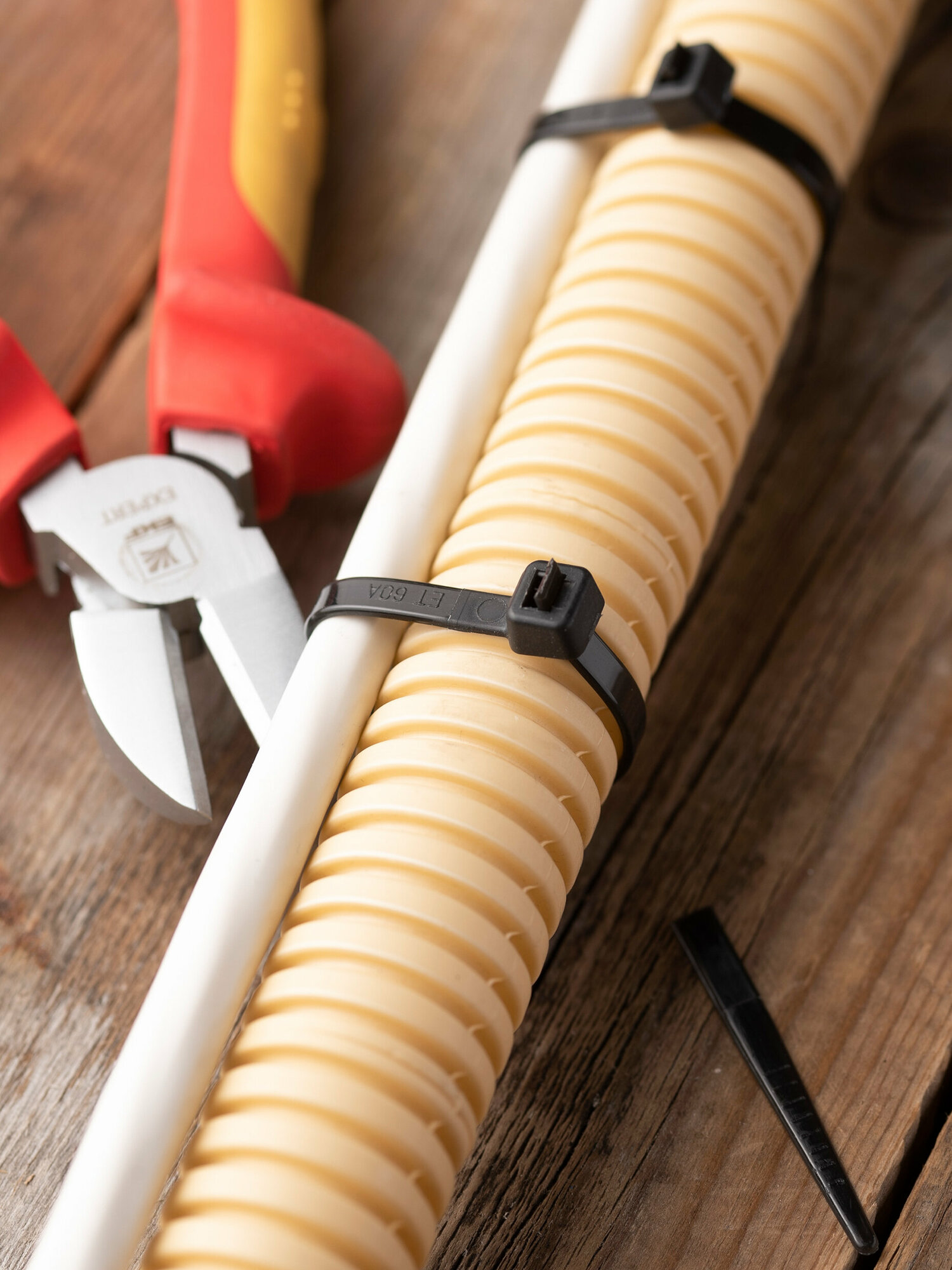 Предназначен для увязки кабелей и проводов в пучок и монтажа кабельных линий и проводников. Ремешок самофиксирующийся, блокирующий механизм. Изготовлен из Nylon 6.6, устойчивого к старению, коррозии, воздействию солей, ультрафиолета, кислот, щелочей, спирта, бензина и масел. При производстве кабельных стяжек черного цвета добавляется угольный порошок, который является одним из наиболее эффективных стабилизаторов. Он улучшает физические свойства продукции в стойкости к погодным условиям и УФ-излучению (прямые солнечные лучи).